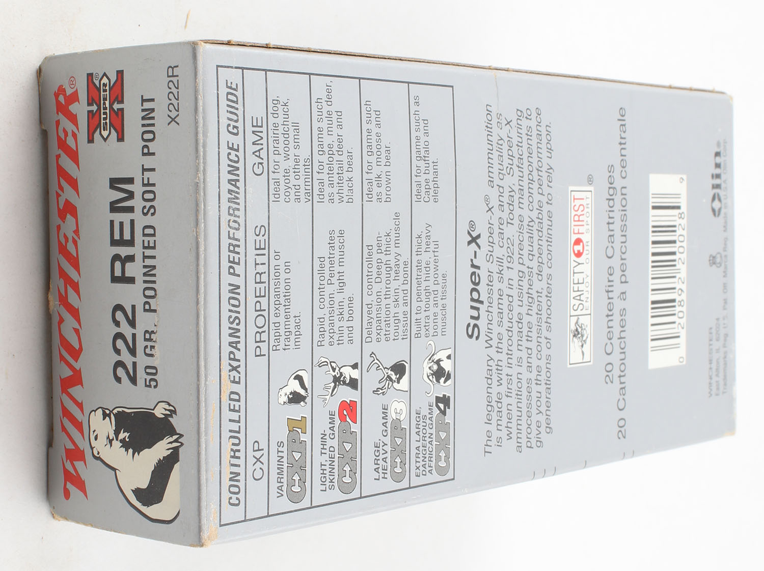 Winchester, Super-X, .222 Rem., 50 Grain Pointed SP, Full, 1pc, Silver & red box, box is solid with excellent color, end flaps are solid, ammo is excellent. Grade: Excellent - Value: 20 to 30