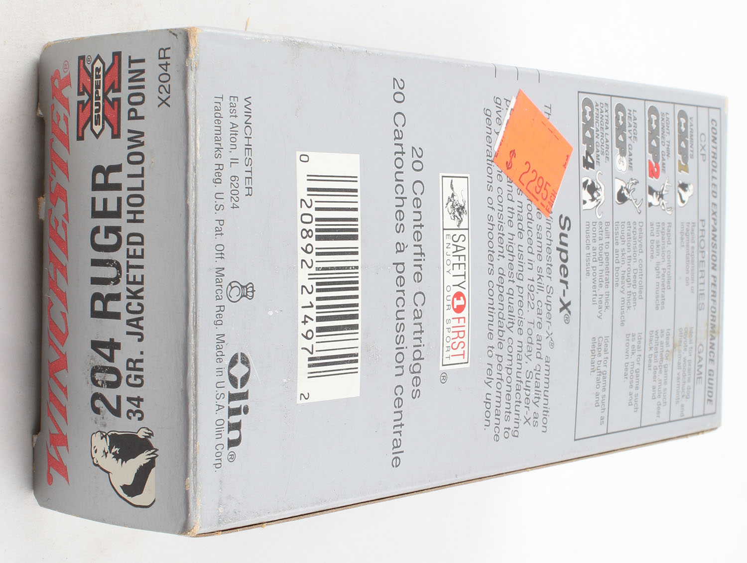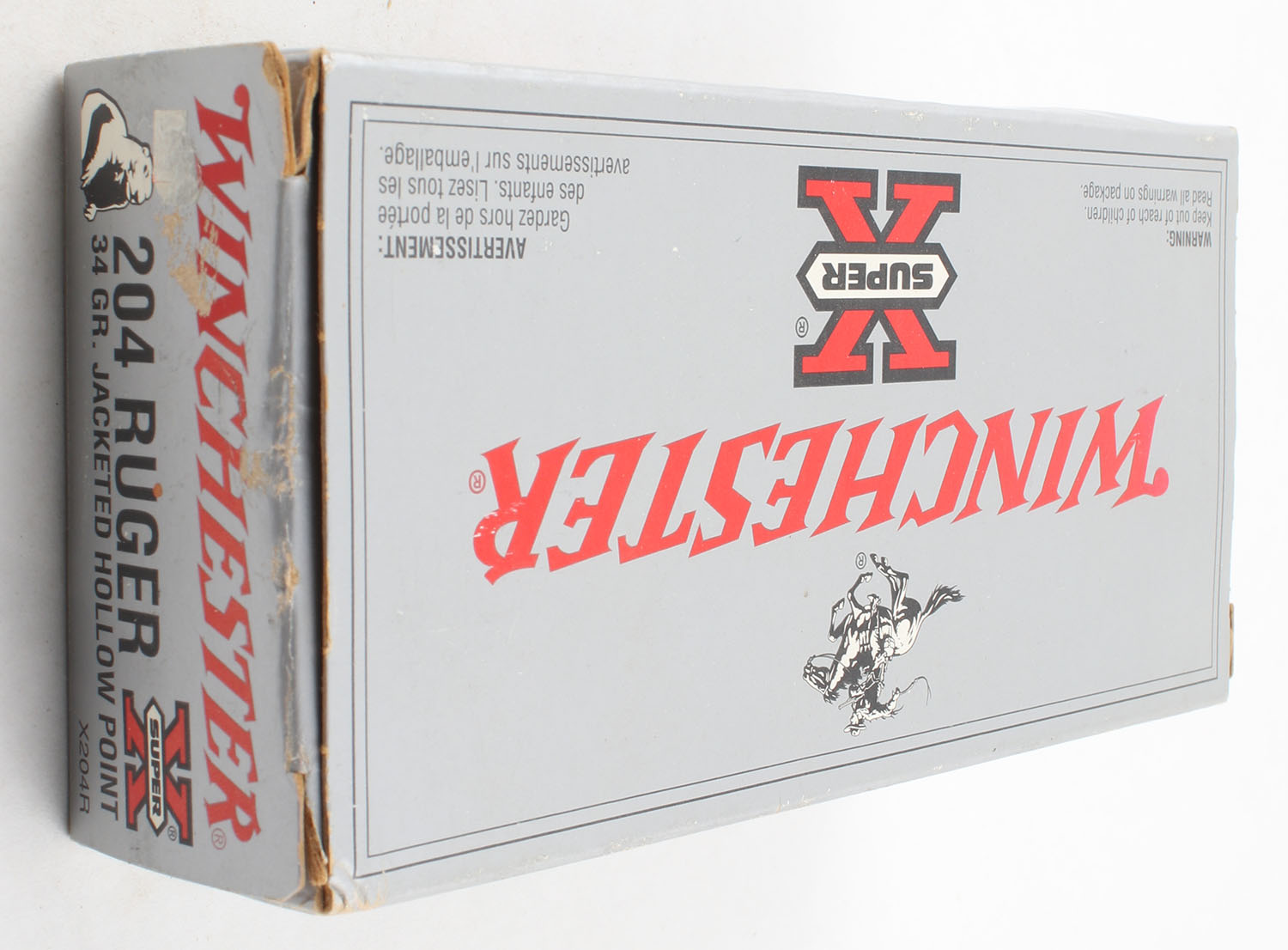 Winchester, Super-X, .204 Ruger, 34 Grain JHP, Full 1pc, Silver & red box, box is solid with very good color, has minor scuffing, end flaps are solid, ammo is very good. Grade: Very Good - Value: 10 to 30