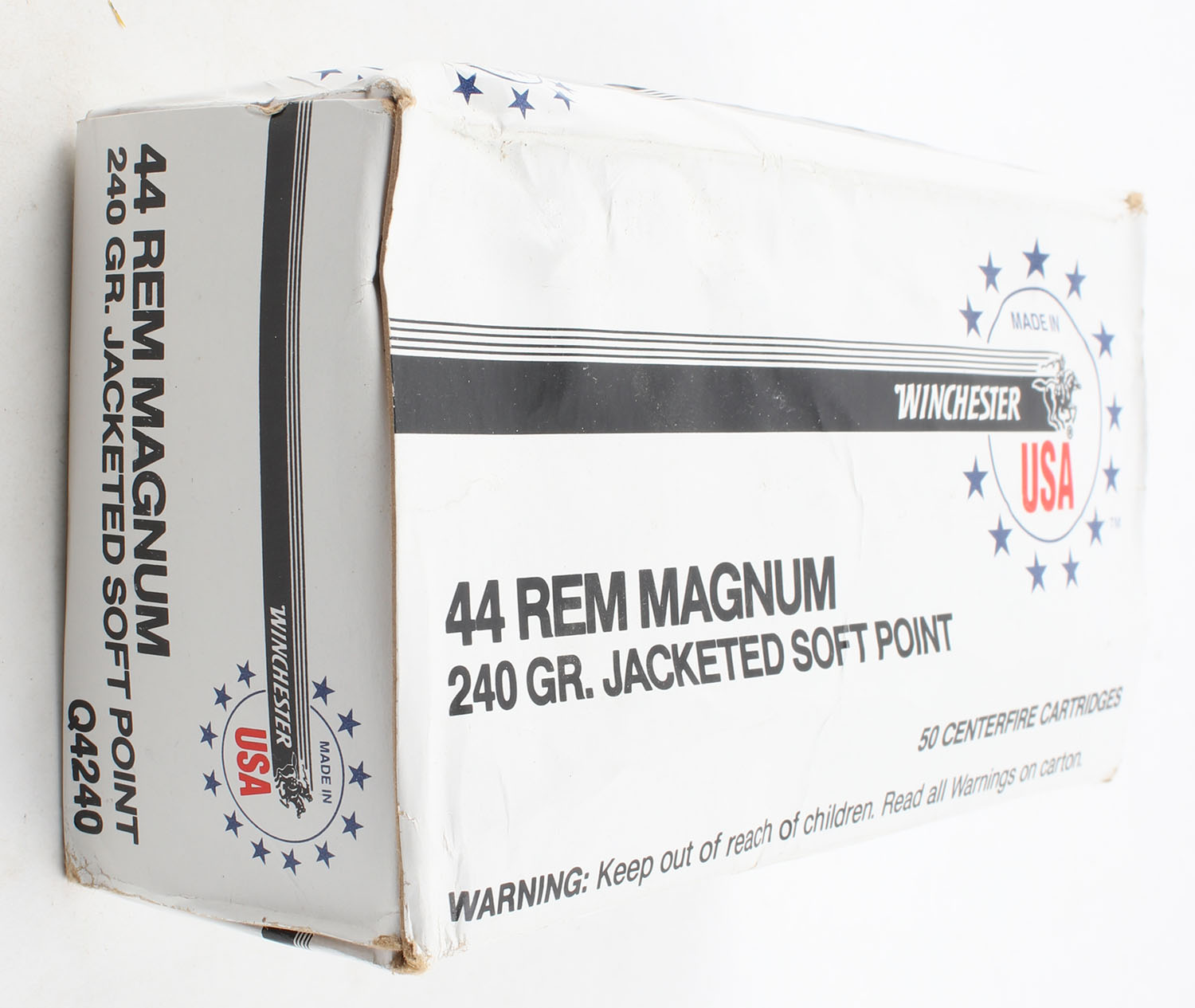 Winchester, USA, .44 Remington Magnum, 240 Grain Jacketed Soft Point, Appears Full, 1pc. White red & black box, box has scuffing with rub marks, edge & corner wear, end flaps are solid, ammo is excellent. Grade: Very Good - Value: 20 to 60