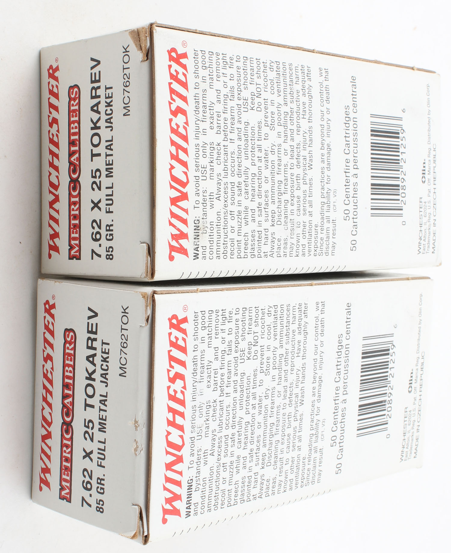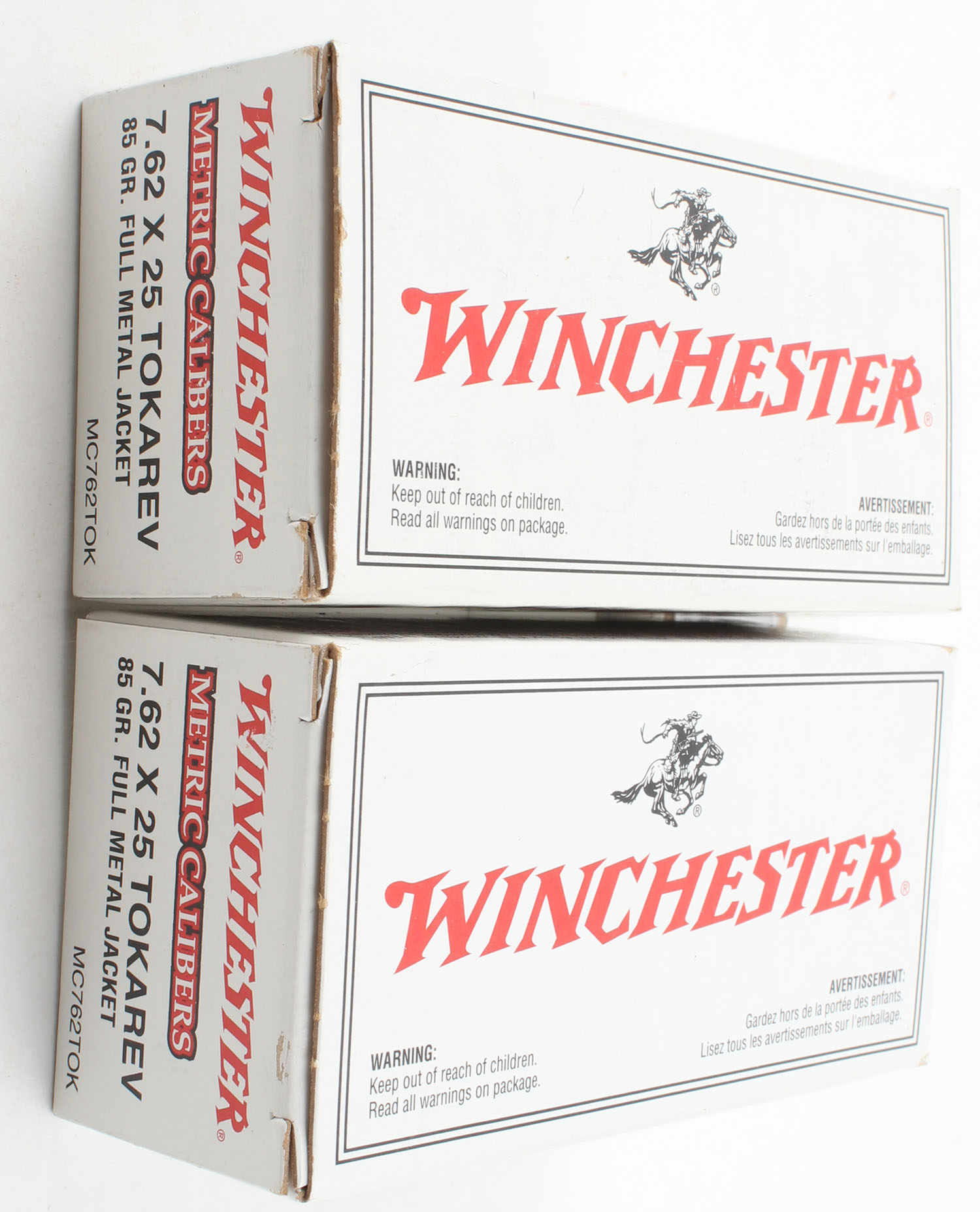 Winchester, Lot of (2), Metric Calibers, 7.62 x 25 Tokarev, 85 Grain FMJ, Full, 1pc. White & red boxes, boxes are very solid with excellent color, ammo is mint. Grade: MINT - Value: 20 to 30