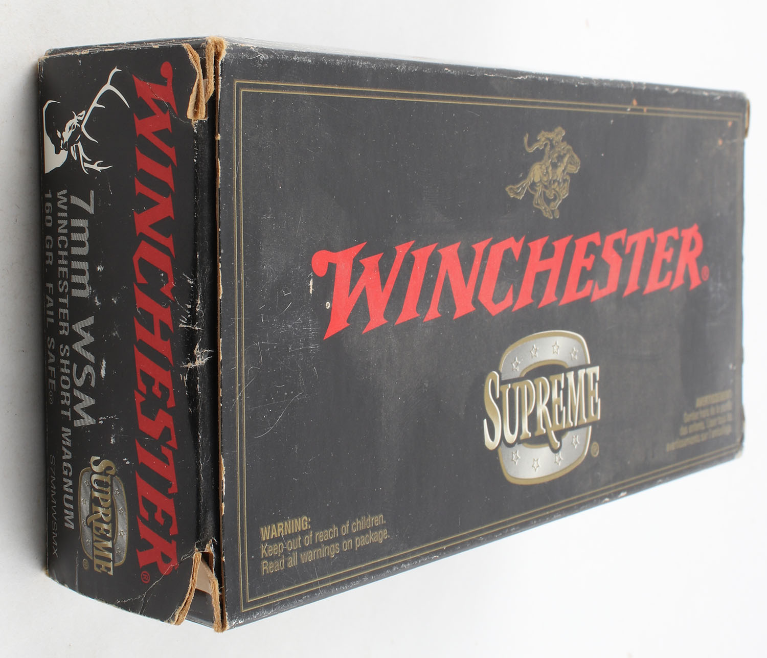 Winchester, Supreme, 7mm WSM, 160 Grain Fail Safe, Full, 1pc. Black & red box, box is solid with excellent color, minor shelf wear, some corner wear, edges are mostly crisp, end flaps are solid, ammo is minty. Grade: Excellent + - Value: 40 to 60