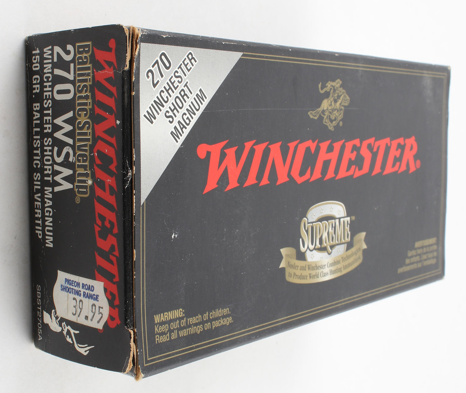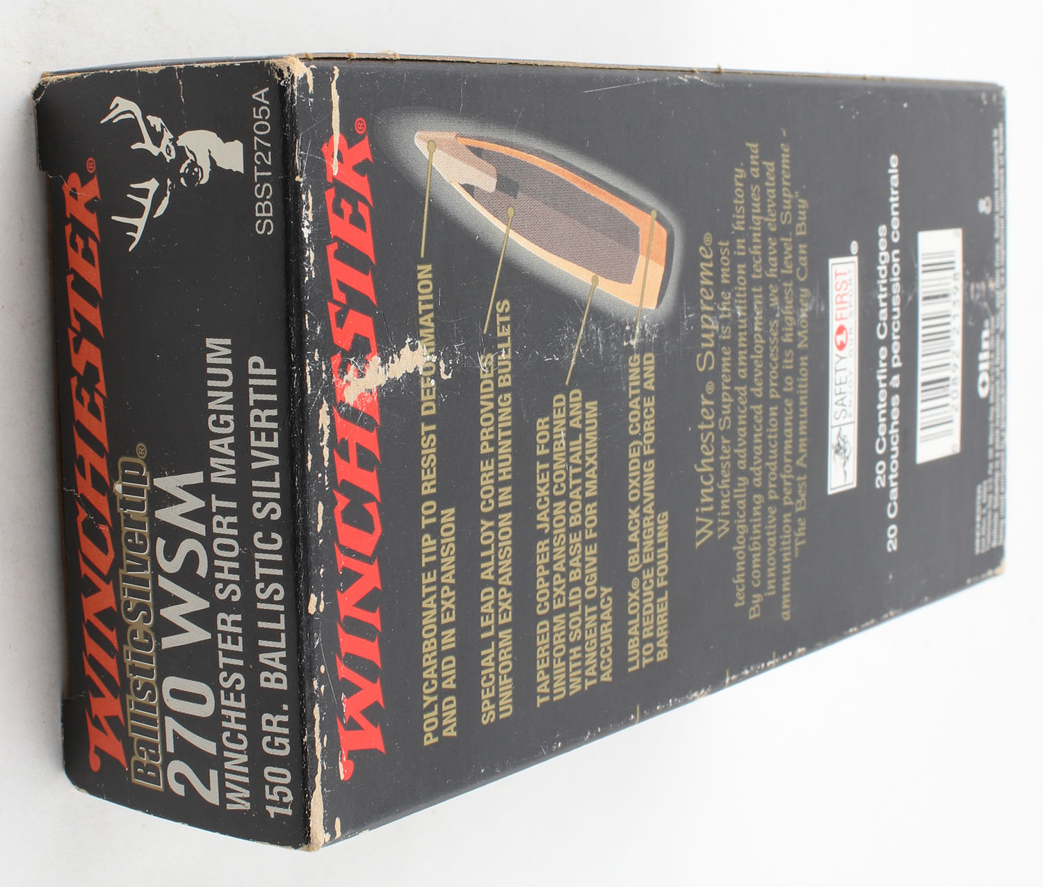 Winchester, Supreme, .270 WSM, 150 Grain Ballistic Silvertip, Full, 1pc. Black box, box is solid with excellent color, very minor shelf wear, minor corner wear, end flaps are solid, ammo is minty. Grade: Excellent + - Value: 30 to 90