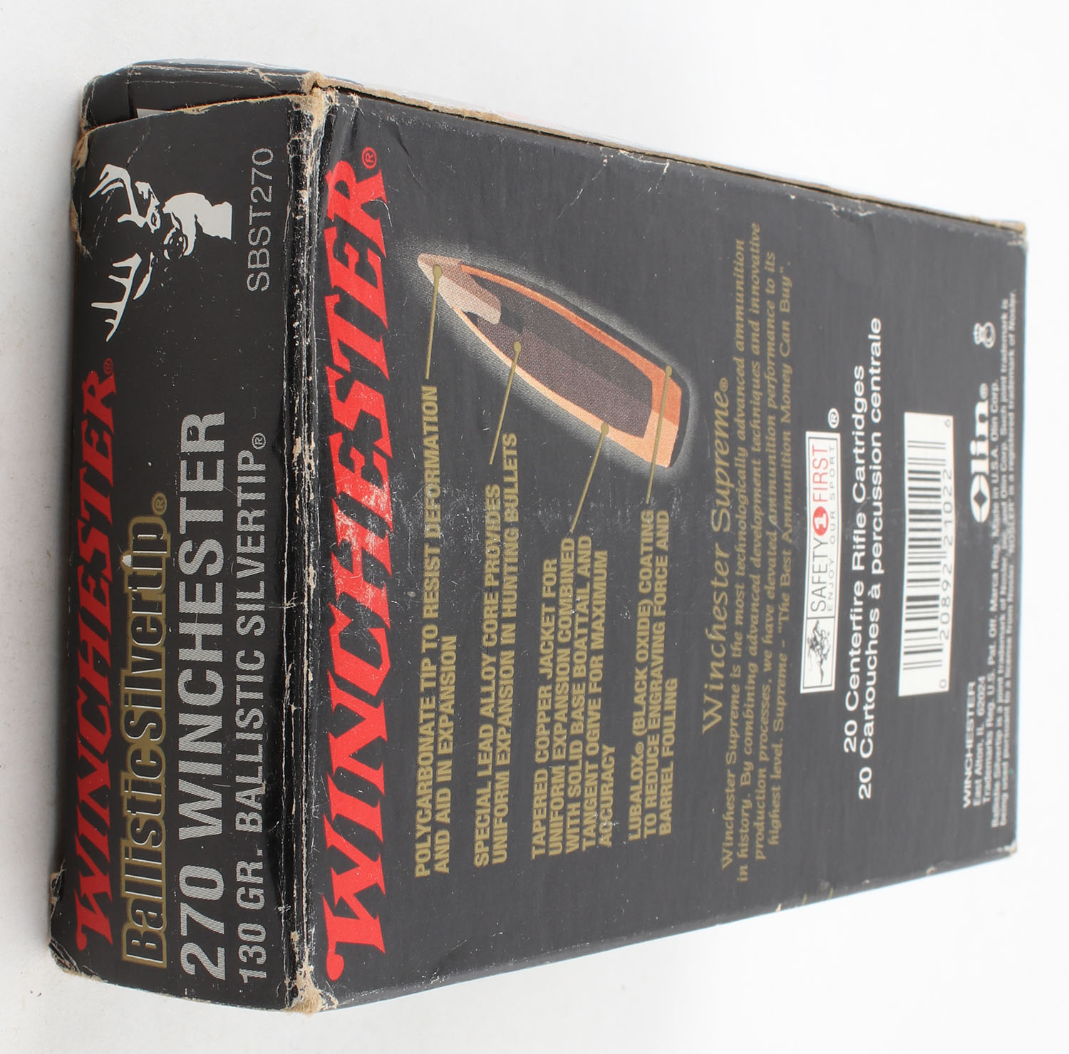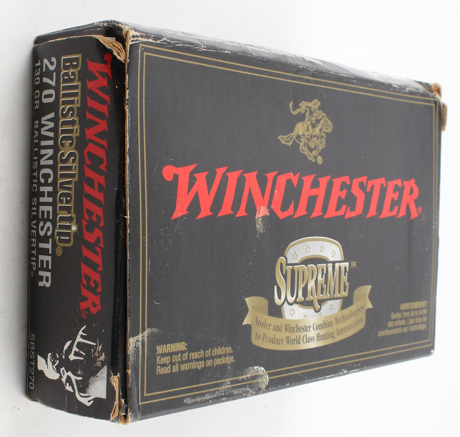 Winchester, Supreme, .270 Winchester, 130 Grain Ballistic Silvertip, Partial 18rds., 1pc. Black & red box, box has edge & corner wear with rub marks, end flaps are solid, ammo is minty. Grade: Excellent - Value: 20 to 60