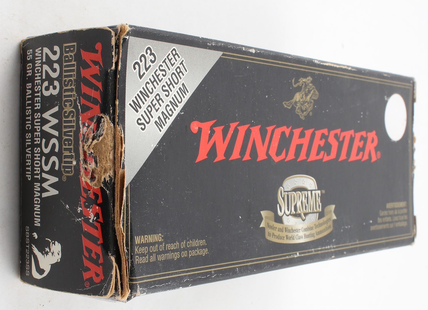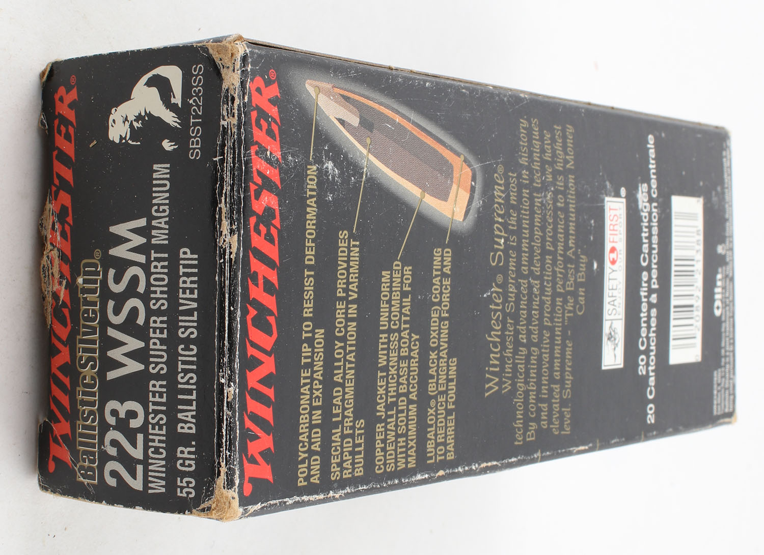Winchester, Supreme, .223 WSSM, 55 Grain Ballistic Silvertip, Full, 1pc. Black & red box, box has scuffing with edge & corner wear, end flaps are solid, ammo is minty. Grade: Excellent - Value: 20 to 60