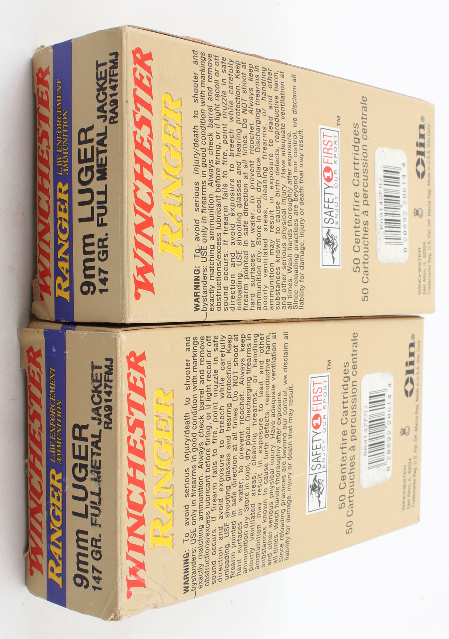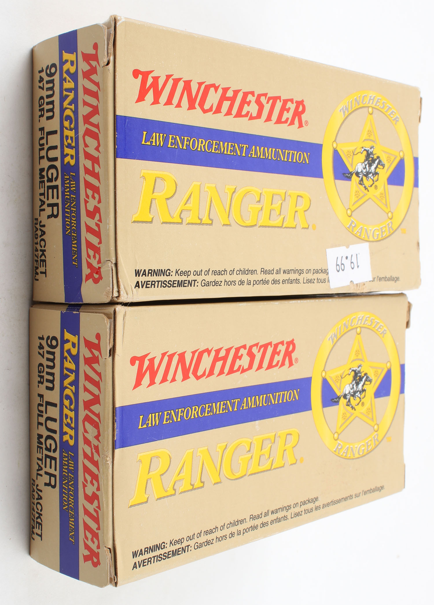 Winchester, Lot of (2), Ranger, 9mm Luger, 147 Grain FMJ, Full, 1pc. Brown yellow & blue boxes, boxes are very solid with excellent color, end flaps are solid, ammo is excellent. Grade: Excellent + - Value: 30 to 60