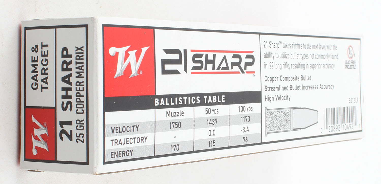 Winchester, Game & Target, 21 Sharp, 25 Grain Copper Matrix, Full, 1pc., Red white & black box, box is very solid with excellent color, edges are crisp, corners are sharp, ammo is mint. Grade: MINT - Value: 20 to 30