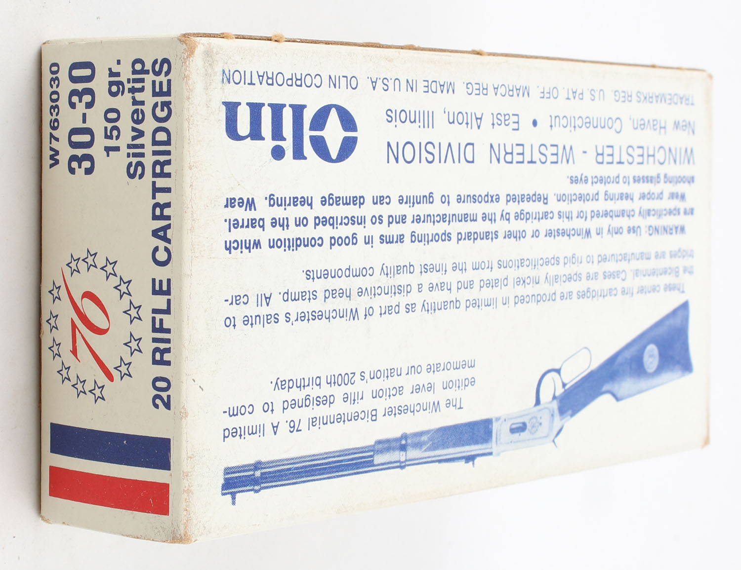 Winchester, Bicentennial, .30-30 Winchester, 150 Gr. Silvertip, Full, 1pc. White blue & red box, box is very solid with excellent color, end flaps are solid, ammo is minty. Grade: Excellent ++ - Value: 20 to 60