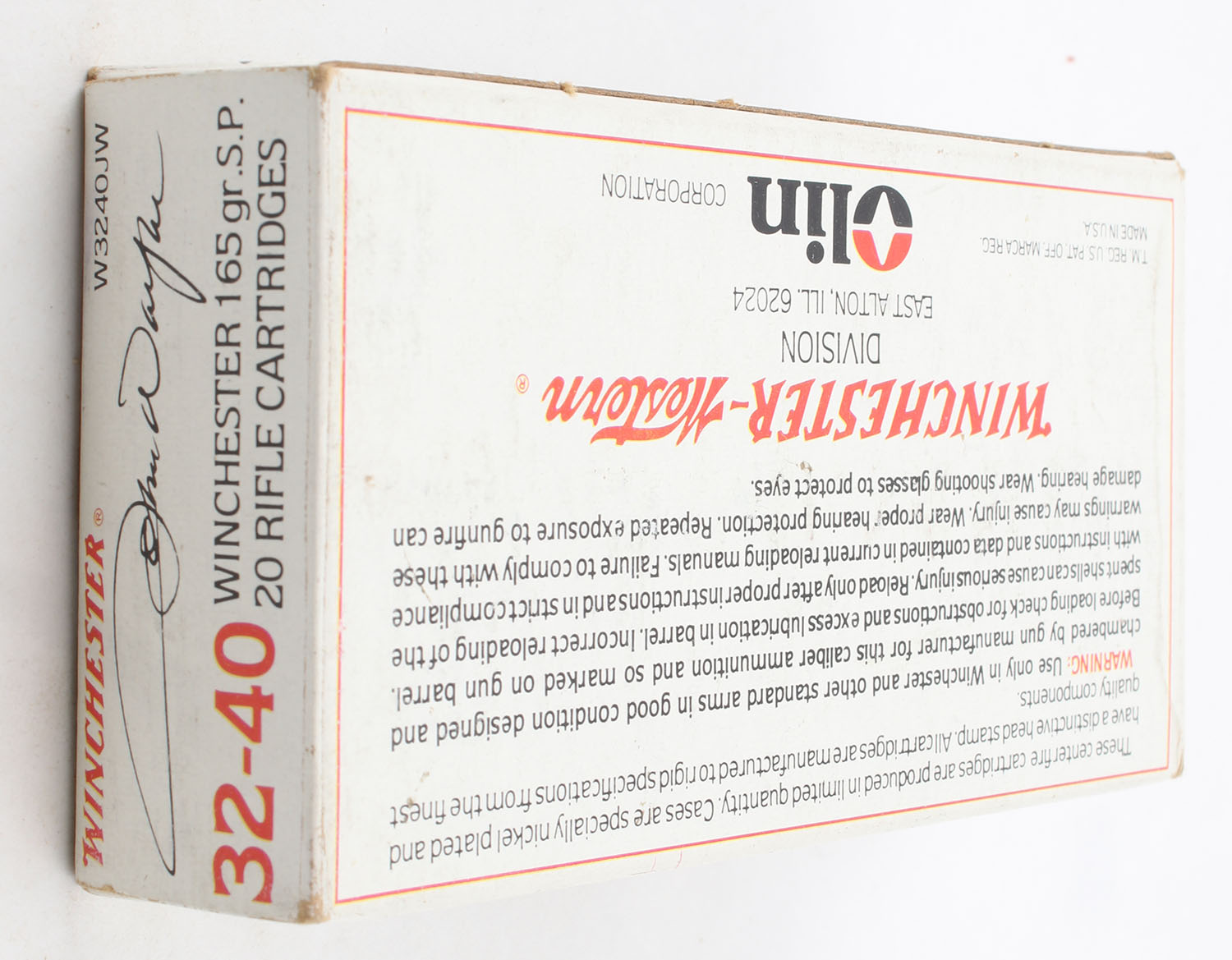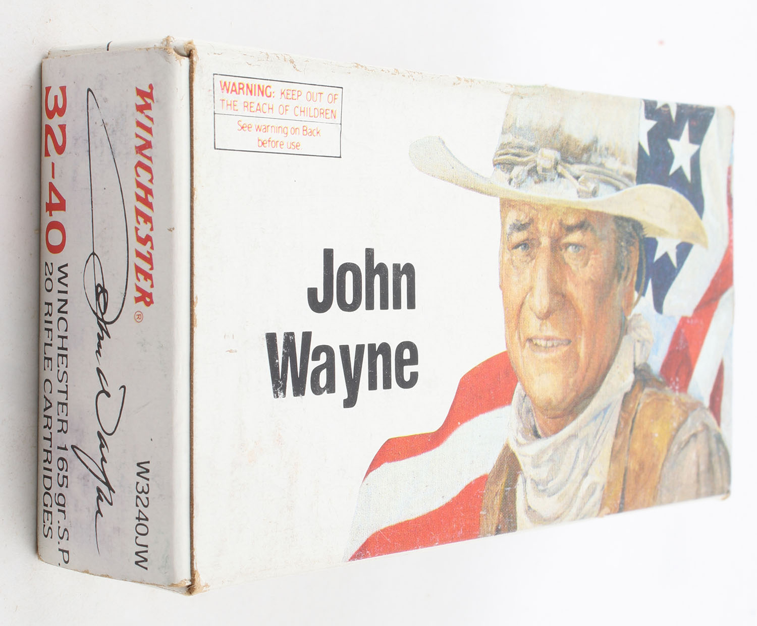 Winchester, John Wayne, .32-40 Winchester, 165 Grain Soft Point, Full, 1pc. White box featuring John Wayne, box is solid with excellent color, has light scuffing, light edge & corner wear end flaps are solid, ammo is minty. Grade: Excellent - Value: 80 to 120