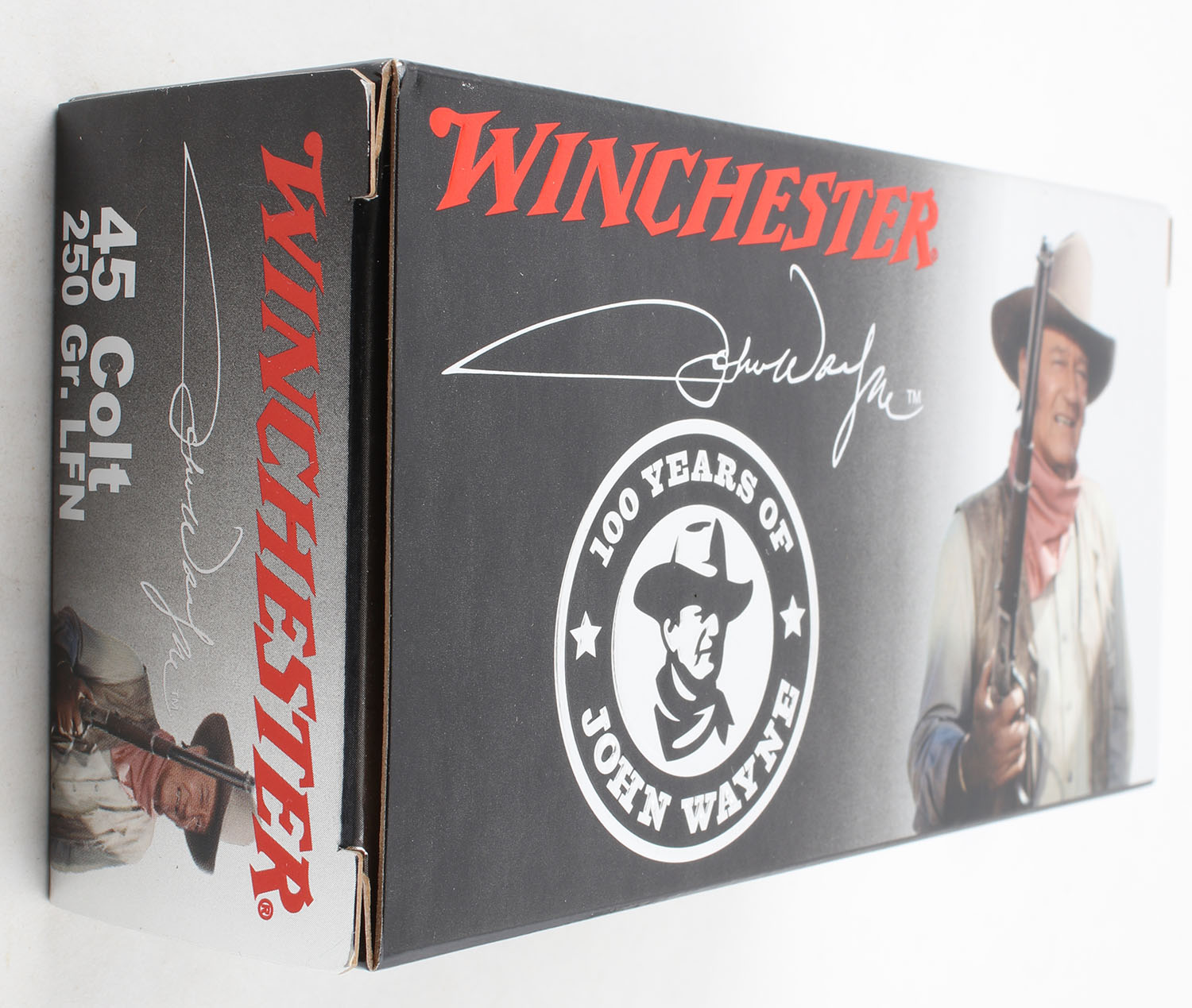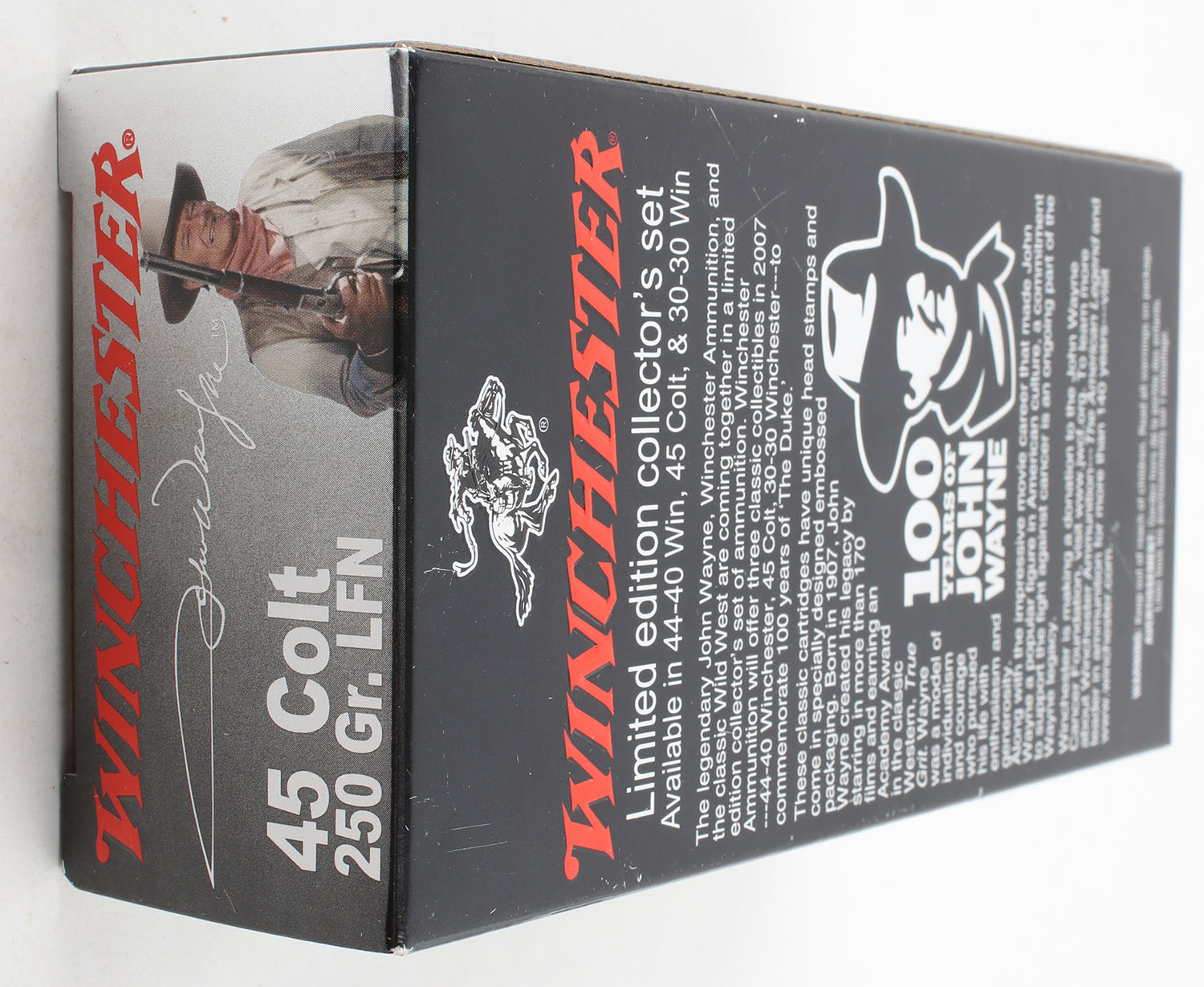 Winchester, 100 Years of John Wayne, .45 Colt, 250 Grain Lead Flat Nose, Full, 1pc. Multi-colored box, box is near mint with minty color, corners are sharp, edges are crisp, end flaps are solid, ammo is minty. Grade: MINT - Value: 80 to 120