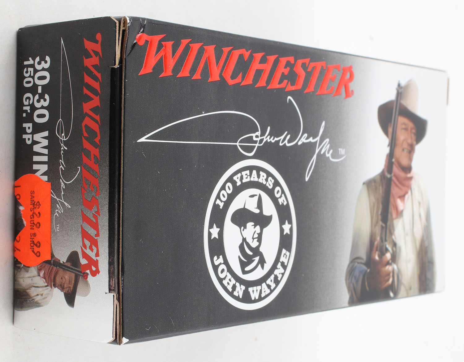 Winchester, 100 Years of John Wayne, .30-30 Winchester, 150 Gr. PP, Full, 1pc. Black silver & red box, box is MINT with minty color, corners are sharp, edges are crisp, end flaps are solid, ammo is minty. Grade: MINT - Value: 60 to 90