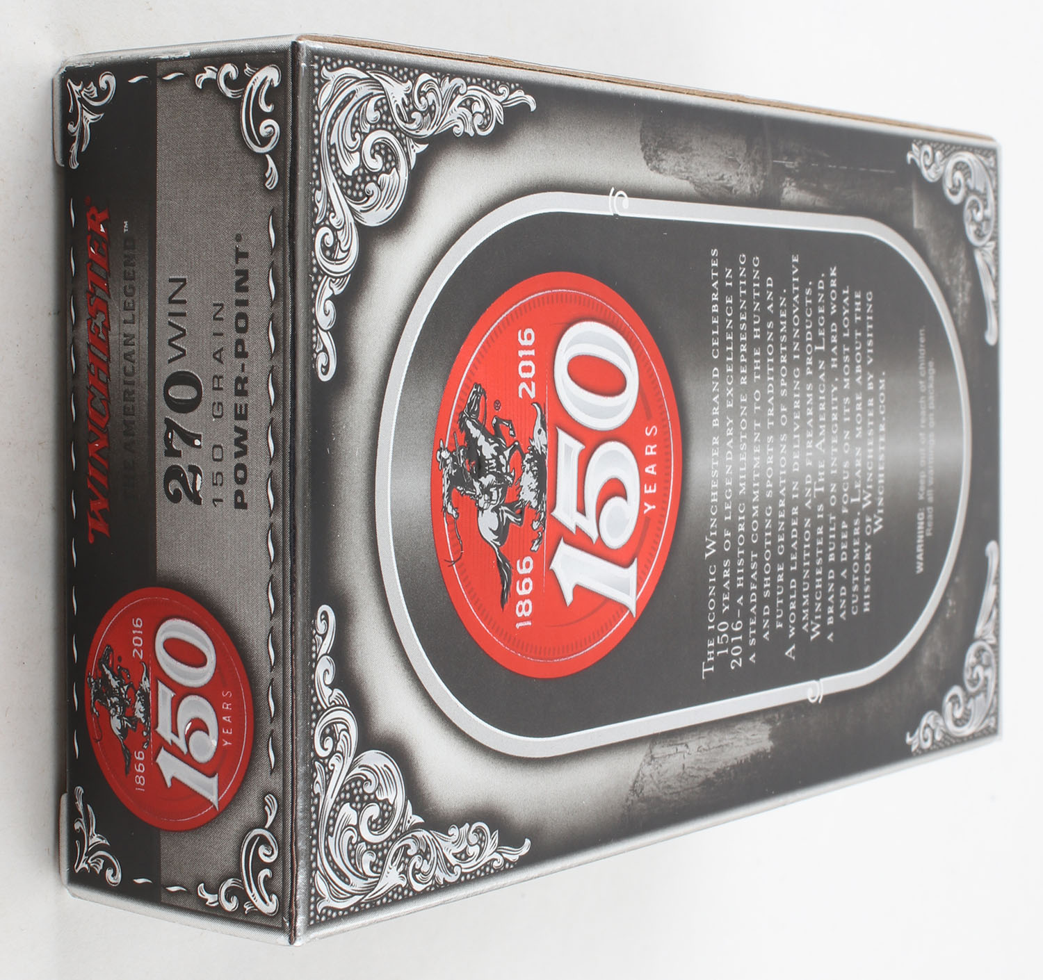 Winchester, The American Legend, 150 Year Commemorative box, .270 Winchester, 150 Grain Power-Point, Full, 1pc. Silver & red box, box is MINT with minty color, corners are sharp, edges are crisp, end flaps are solid, ammo is minty. Grade: MINT - Value: 60 to 90