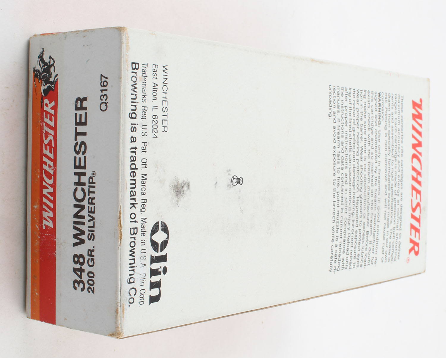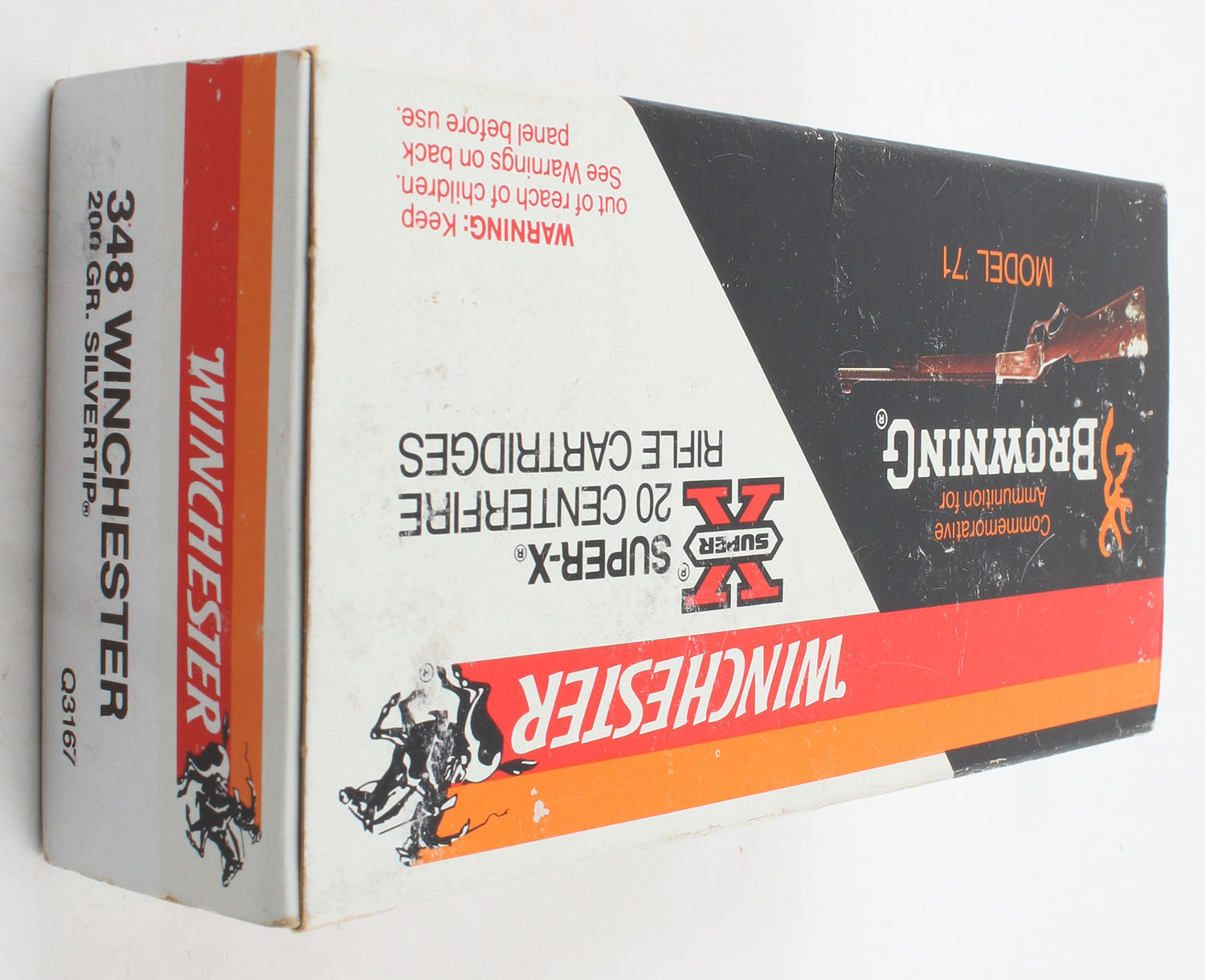 Winchester, Browning Model '71 Commemorative Box, .348 Winchester, 200 Grain Silvertip, Partial 12rds., 1pc. Multi-colored box featuring a model 71, box is solid with excellent color, light scuffing with some rub marks, very minor edge & corner wear, end flaps are solid, ammo is excellent. Grade: Very Good ++ - Value: 40 to 60