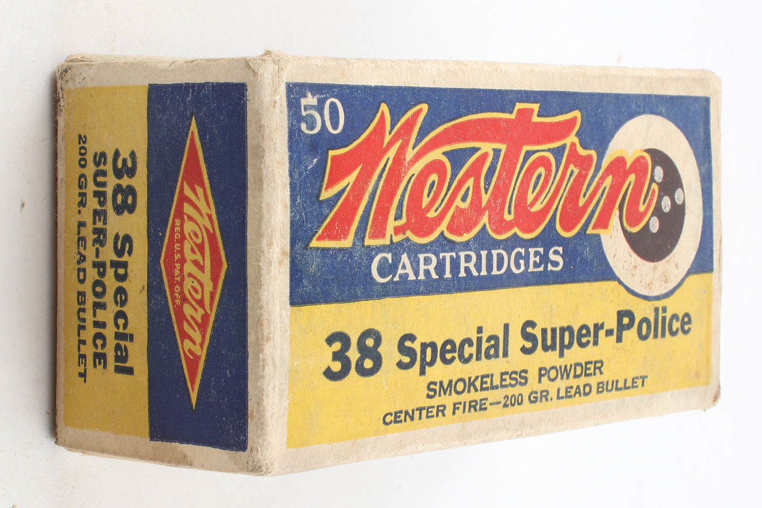 Western, Cartridges, .38 Special Super-Police, 200 Grain Lead Bullet, Partial 47rds., 1pc. Yellow blue & red bullseye box, box is solid with very good color, has light age soiling with some scuffing, light edge & corner wear, end flaps are solid, ammo is very good. Grade: Very Good ++ - Value: 20 to 60