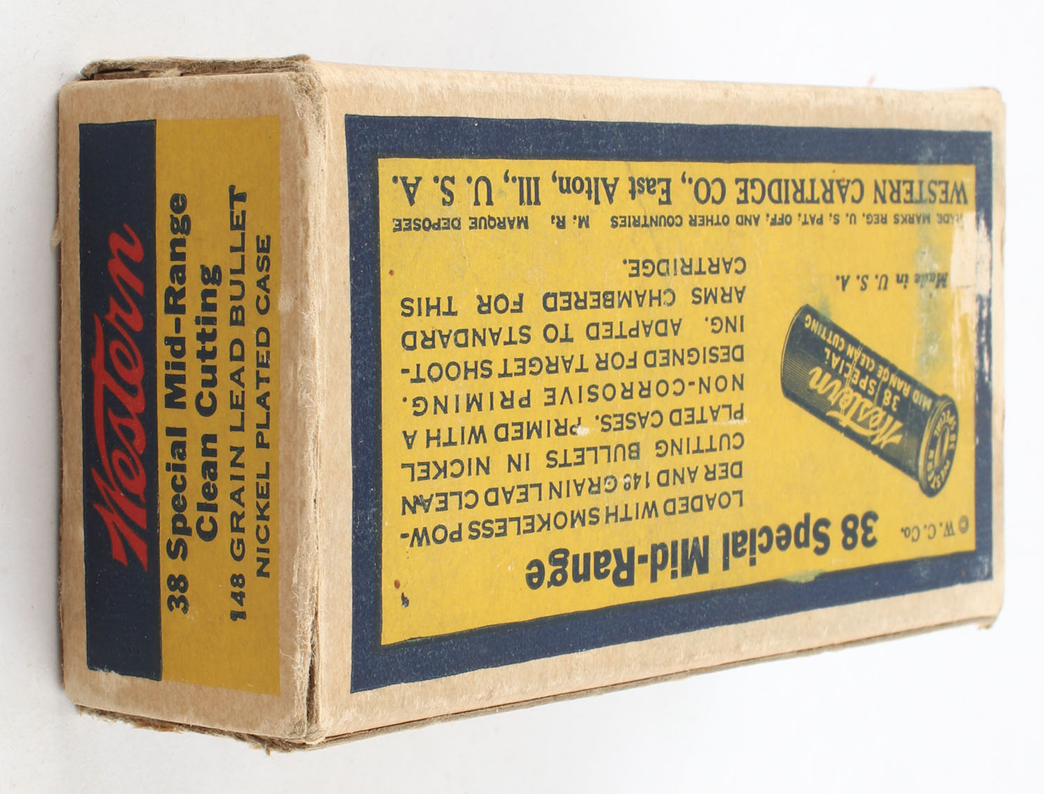 Western, Cartridges, .38 Special Mid-Range, 148 Grain Lead Clean Cutting Bullet, Nickel Plated, Full, 1pc. Yellow blue & red First Issue 1930 bullseye box, box has shelf wear with very good color, has light edge & corner wear, end flaps are solid, ammo is very good. Grade: Very Good ++ - Value: 20 to 60