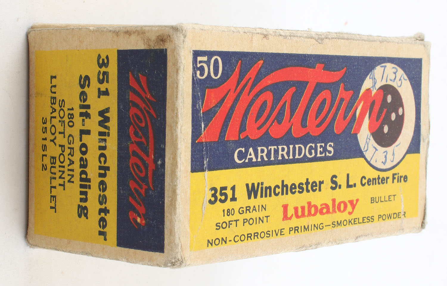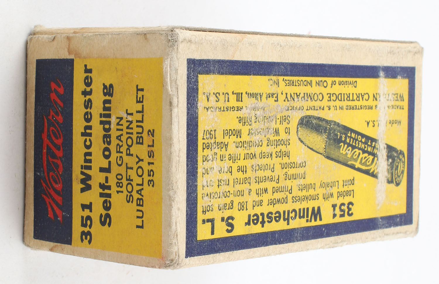 Winchester, Cartridges, .351 Winchester Self-Loading, Center Fire, 180 Grain S.P. Lubaloy Bullet, Full with 35rds. Being correct, 1pc. Yellow blue & red bullseye box, box is solid with very good color, box has age soiling, edge & corner wear, has writing to front, end flaps are solid, ammo is excellent. Grade: Very Good ++ - Value: 40 to 150