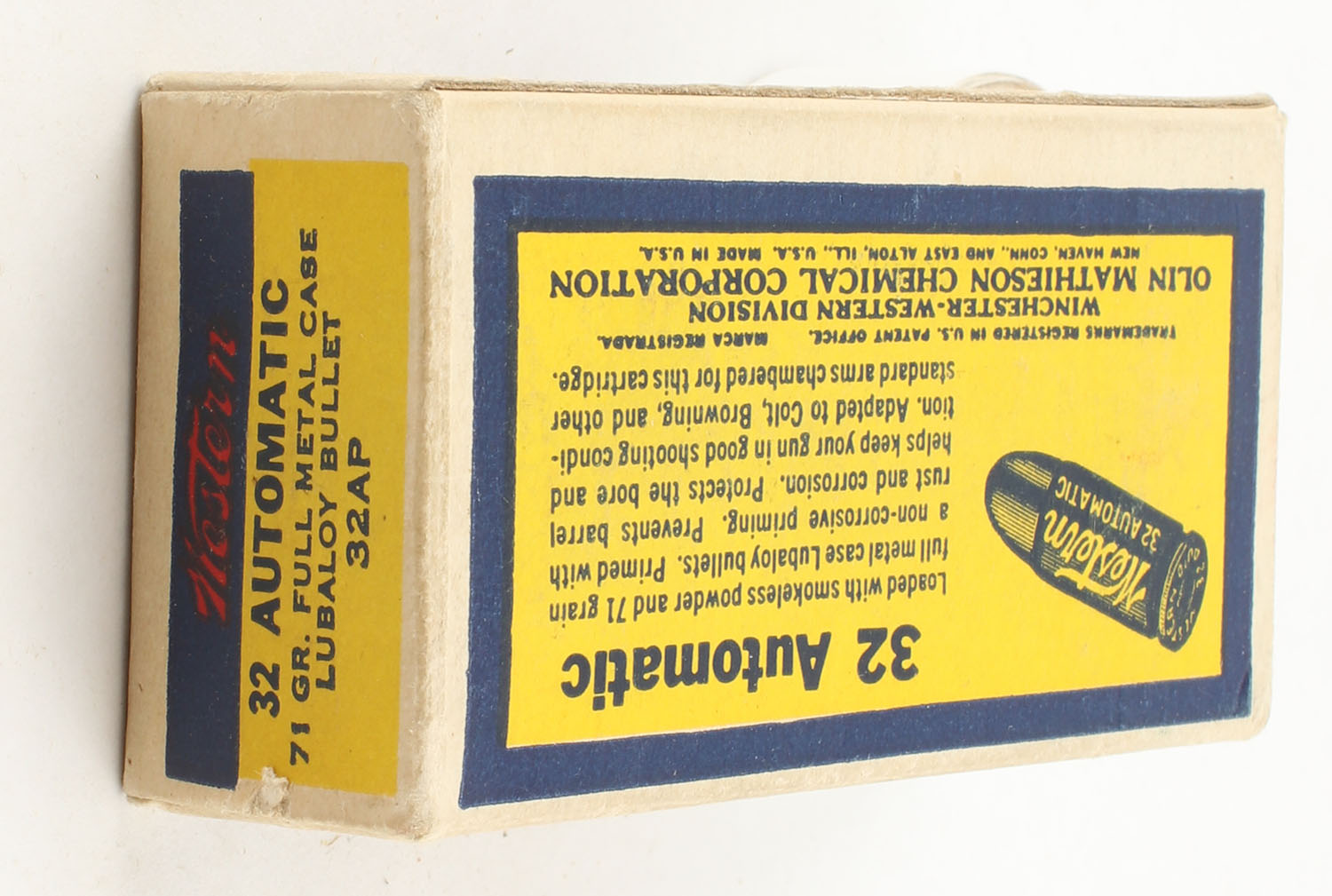 Western, Cartridges, .32 Auto., Center Fire, 71 Grain Full Metal Case Lubaloy Bullet, Full, 1pc. Yellow blue & red bulls eye box, box is very solid with excellent color, corners are sharp, edges are crisp, end flaps are solid, ammo is excellent. Grade: Excellent + - Value: 10 to 40