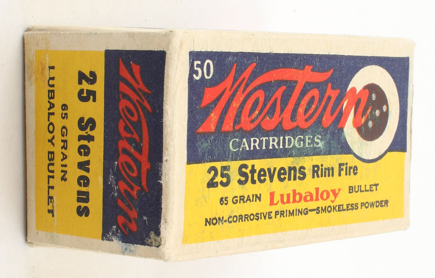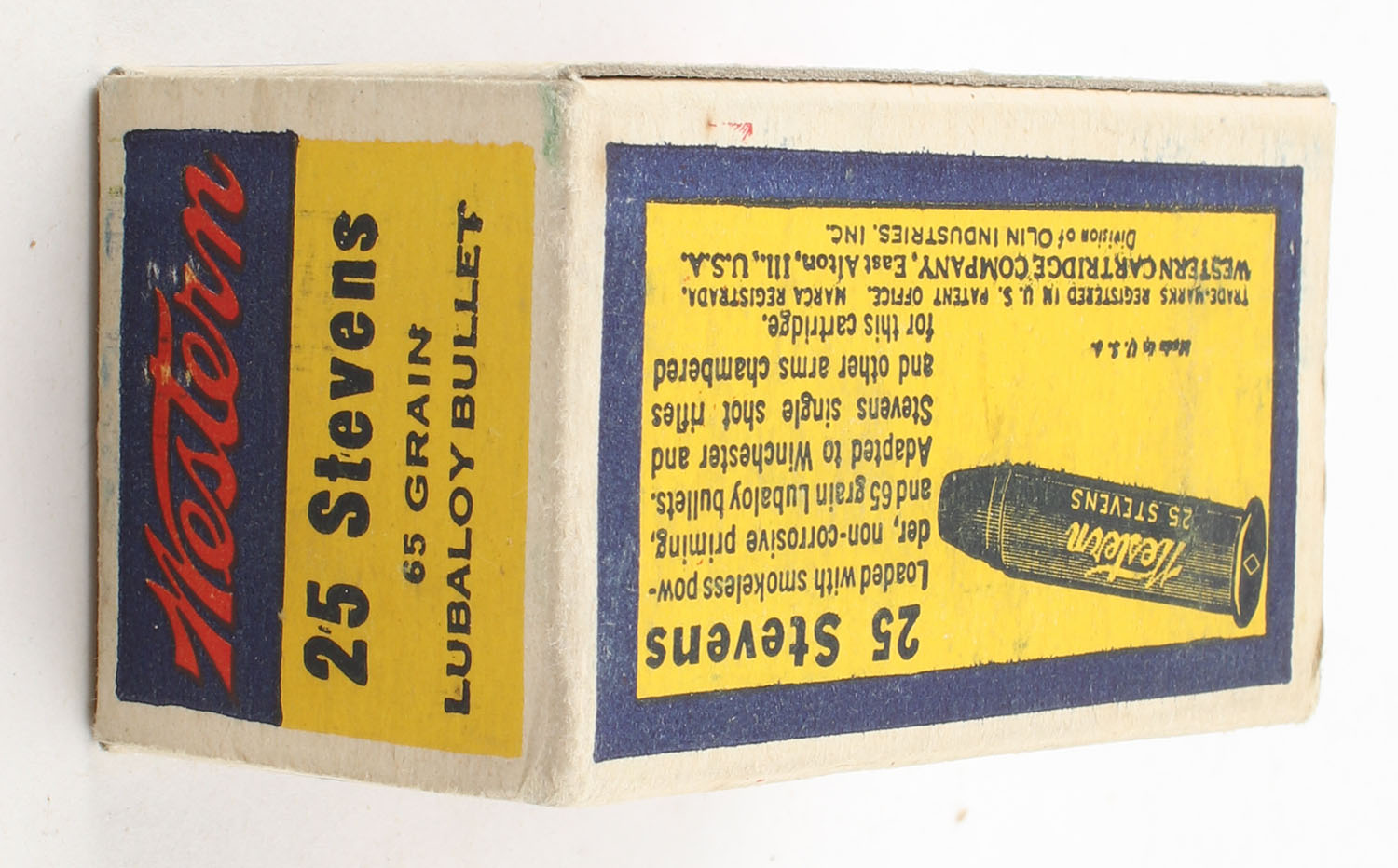 Western, Cartridges, .25 Stevens Rim Fire, 65 Grain Lubaloy Bullet, Full, 1pc., Yellow blue & red bulls eye box, box is vey solid with excellent color, corners are sharp, edges are crisp, end flaps are solid, ammo is excellent. Grade: Excellent ++ - Value: 80 to 150