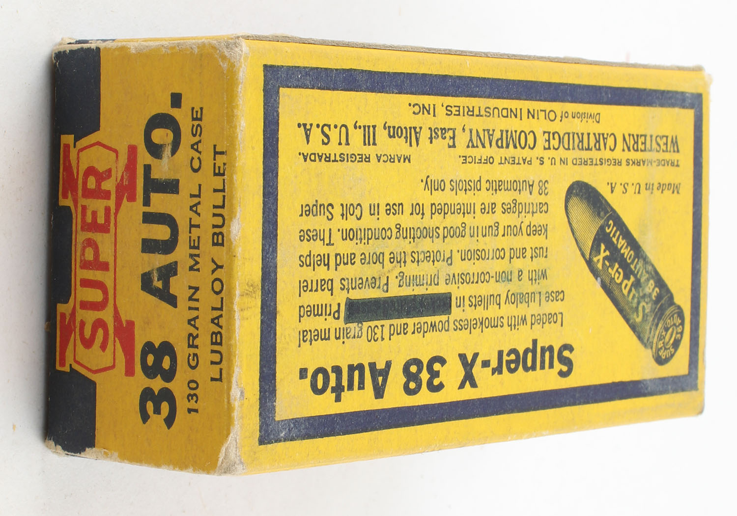 Western, Super-X, .38 Automatic, 130 Grain Metal Case Lubaloy Bullet, Full, 1pc. Yellow blue & red box, box is solid with very good color, has light scuffing, minor corner wear, end flaps are solid, ammo is excellent. Grade: Excellent - Value: 20 to 40
