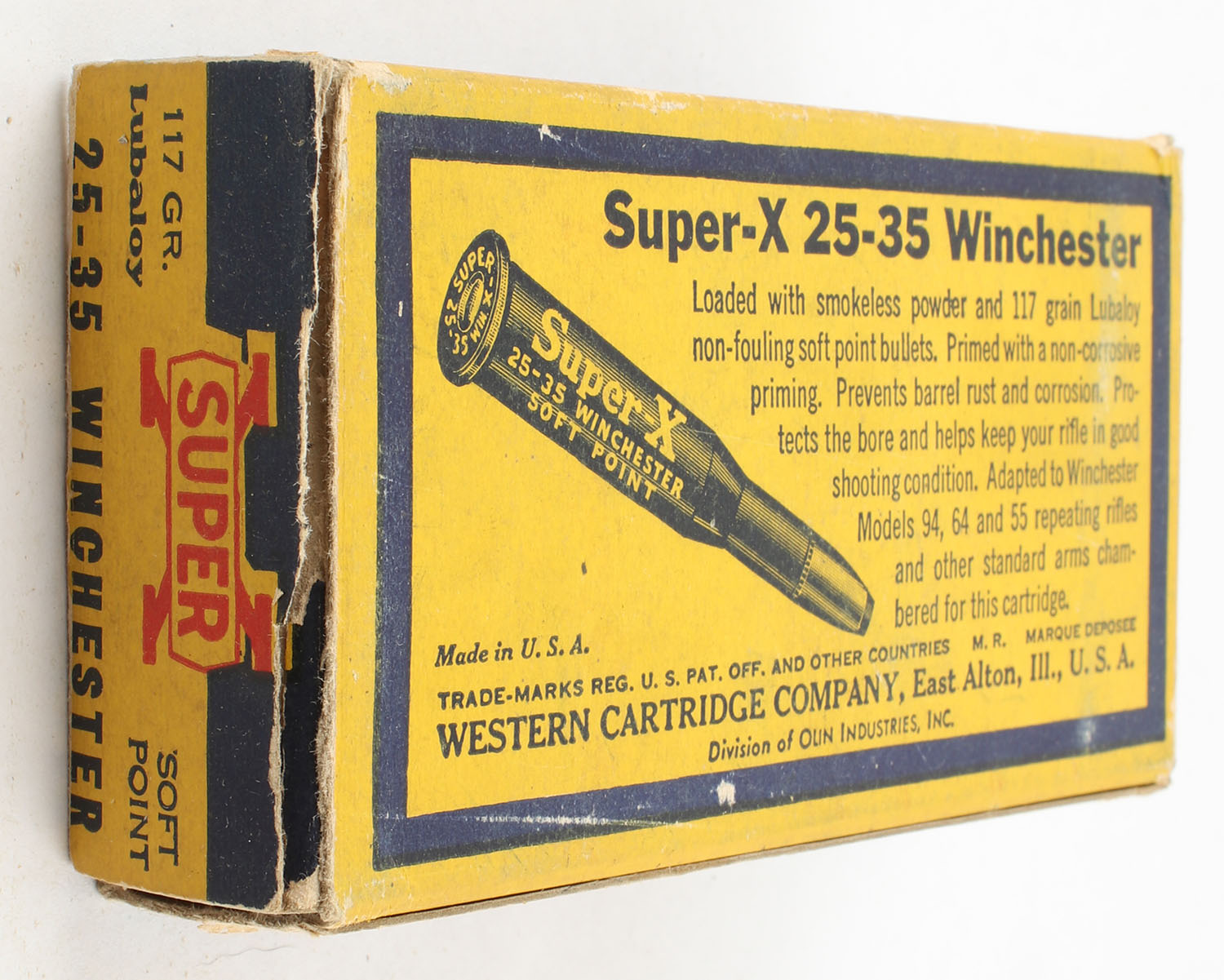 Western, Super-X, .25-35 Winchester, 117 Grain Lubaloy Soft Point Bullet, Full, 1pc. Yellow blue & red box, box is solid with excellent color, has minor edge & corner wear, left end flap is solid, right end flap is torn, ammo is excellent. Grade: Very Good ++ - Value: 50 to 75