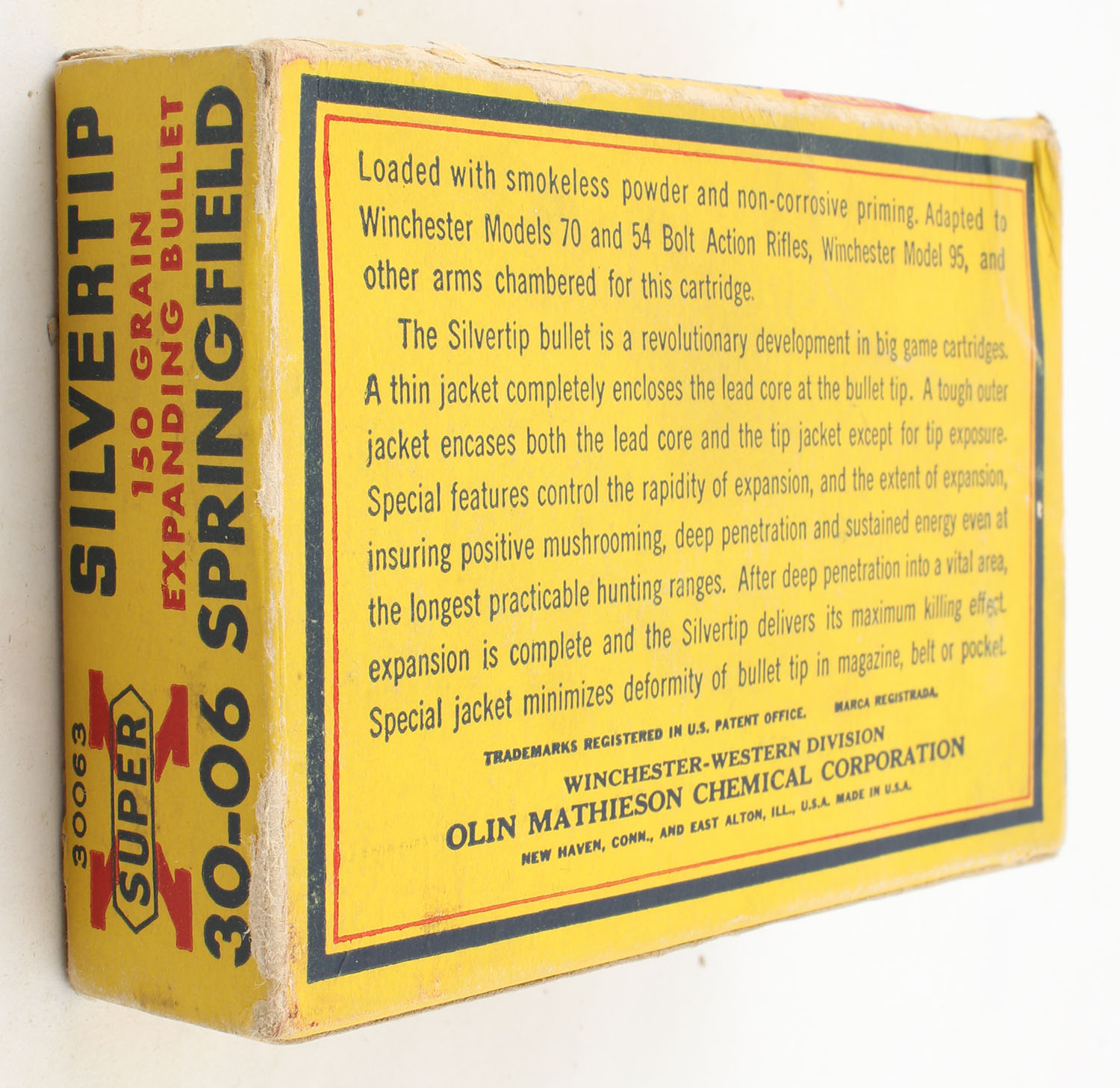 Western, Super X Silvertip, .30-06 Springfield, 150 Grain Controlled Expanding Bullet, Full, 1pc. Yellow blue & red box, box is very solid with excellent color, has light edge & corner wear, end flaps are solid, ammo is excellent. Grade: Excellent + - Value: 20 to 60