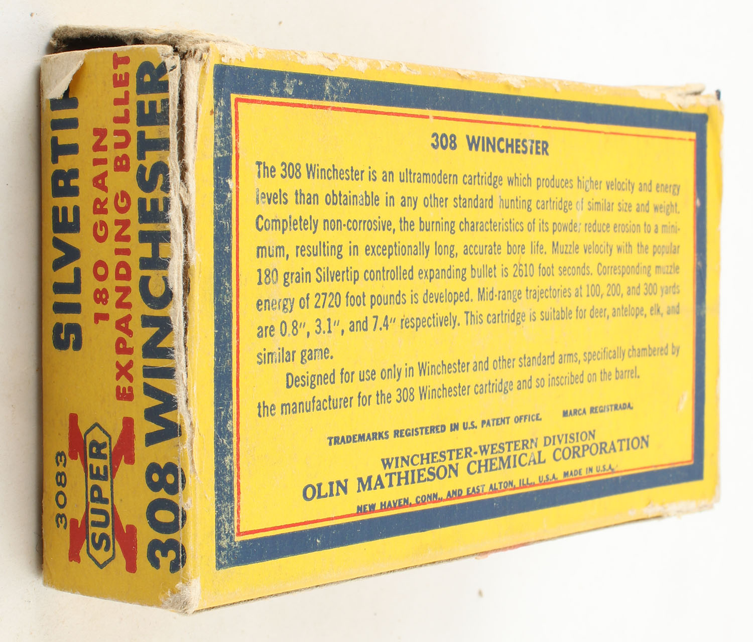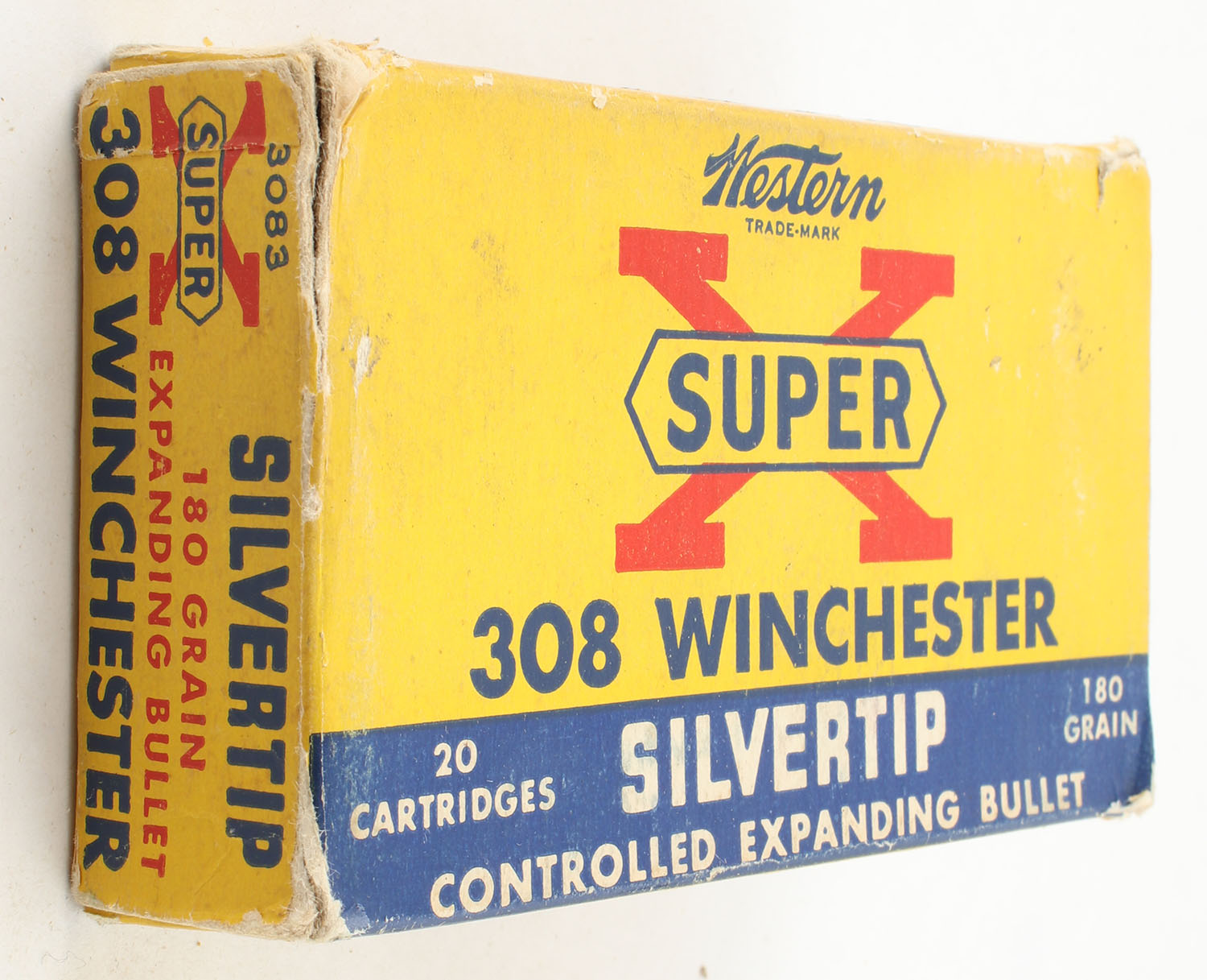 Western, Super X Silvertip, .308 Winchester, 180 Grain Controlled Expanding Bullet, Full, 1pc. Yellow blue & red box, box is solid with very good color, box has scuffing, edge & corner wear, end flaps are solid, ammo is excellent. Grade: Very Good ++ - Value: 40 to 60
