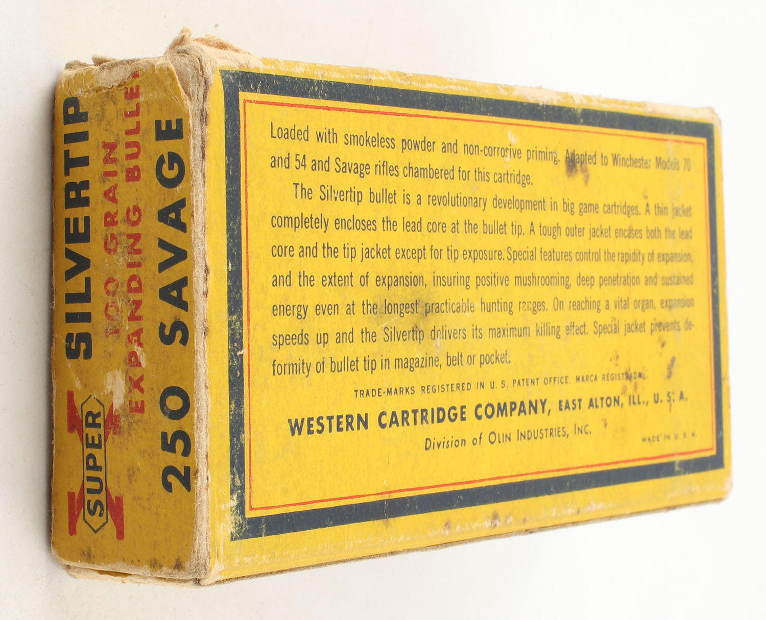 Western, Super-X Silvertip, .250 Savage, 100 Grain Controlled Expanding Bullet, Full, 1pc. Yellow blue & red box, box is solid with good color, has light age soiling with scuffing, edge & corner wear, end flaps are solid, ammo is excellent. Grade: Very Good - Value: 50 to 75