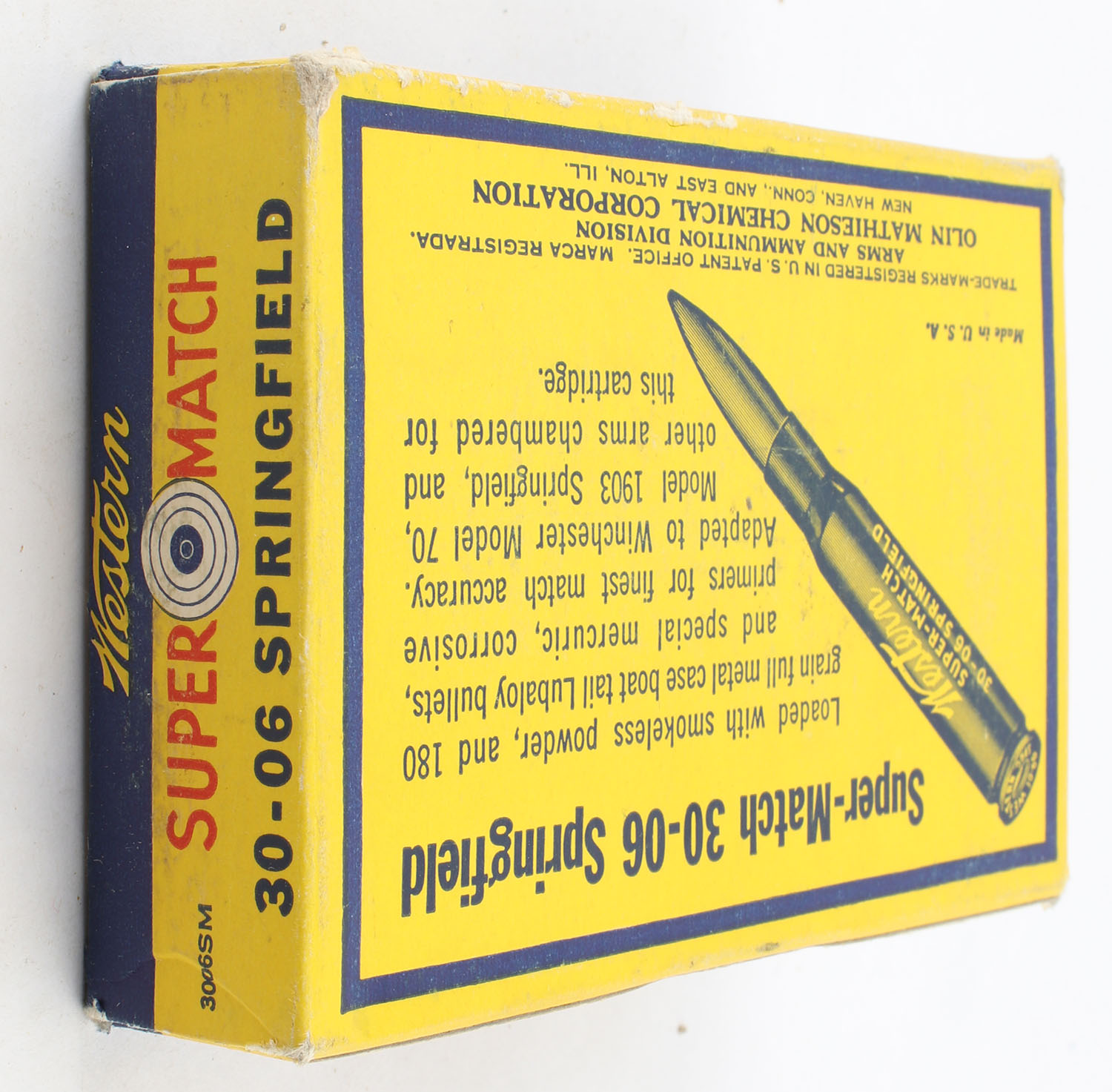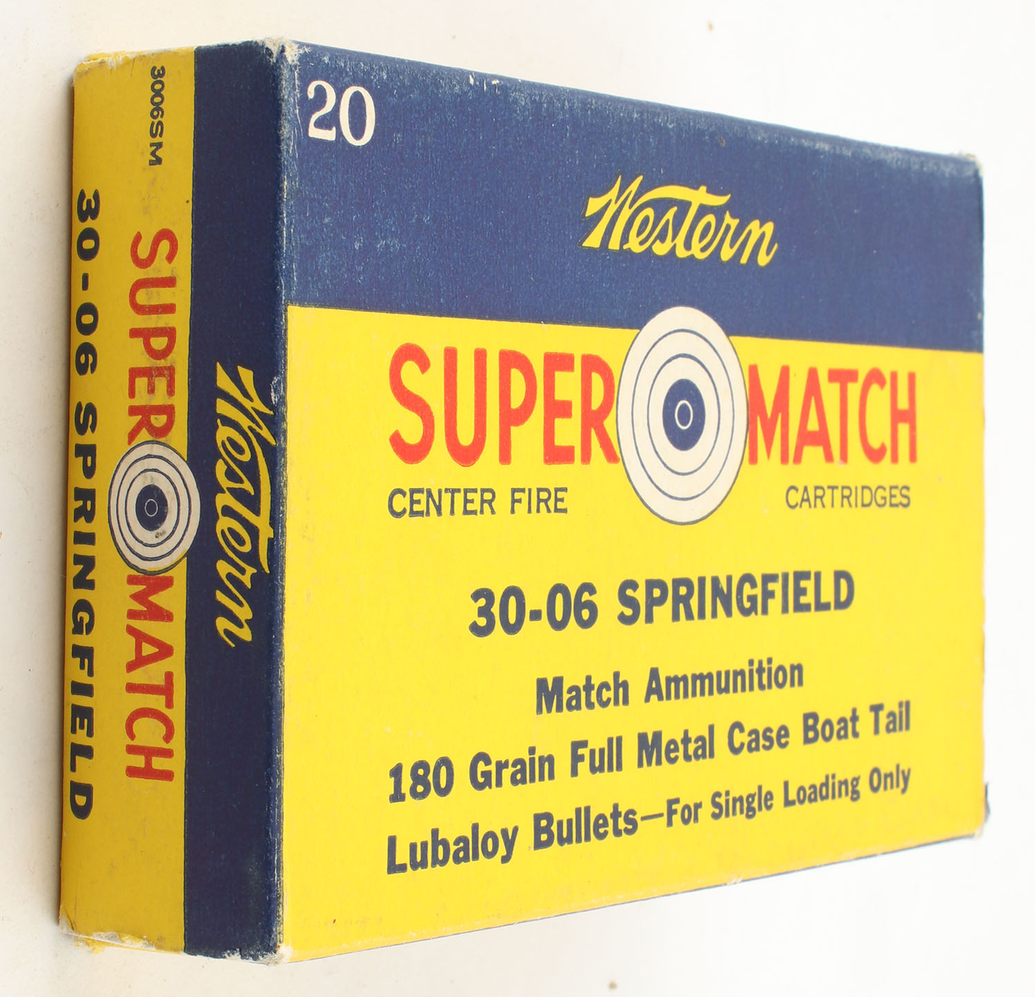 Western, Super Match, .30-06 Springfield, 180 Grain Full Metal Case Boat Tail Lubaloy Bullets, Full, 1pc. Yellow blue & red box, box is solid with excellent color, very minor corner wear, edges are mostly crisp, end flaps are solid, ammo is excellent. Grade: Excellent + - Value: 24 to 36