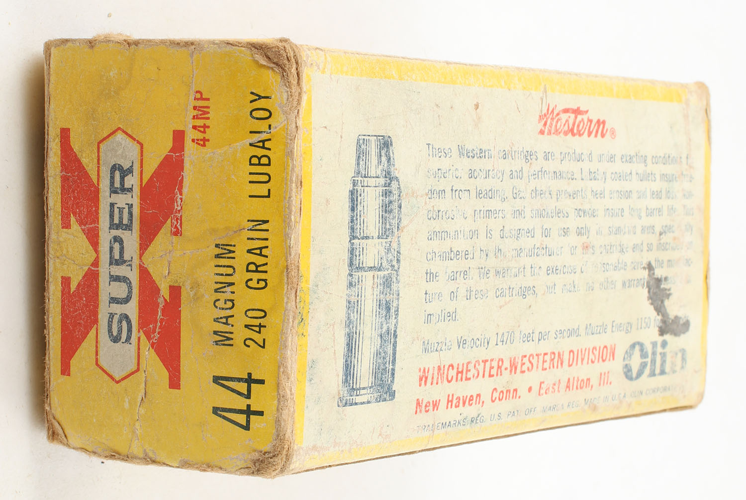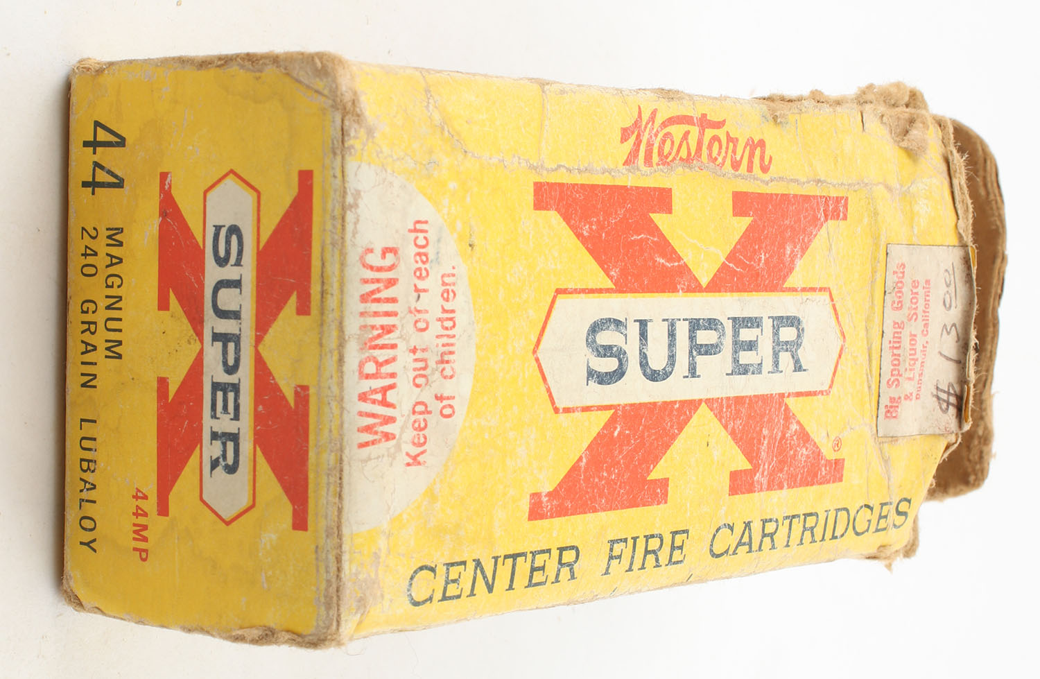 Western, Super X, .44 Magnum, 240 Grain Lubaloy Gas Check Bullet, Partial 48rds., 1pc. Yellow white & red box, box has age soiling with scuffing, edge & corner wear, end flaps are solid, ammo is excellent. Grade: Very Good - Value: 20 to 60
