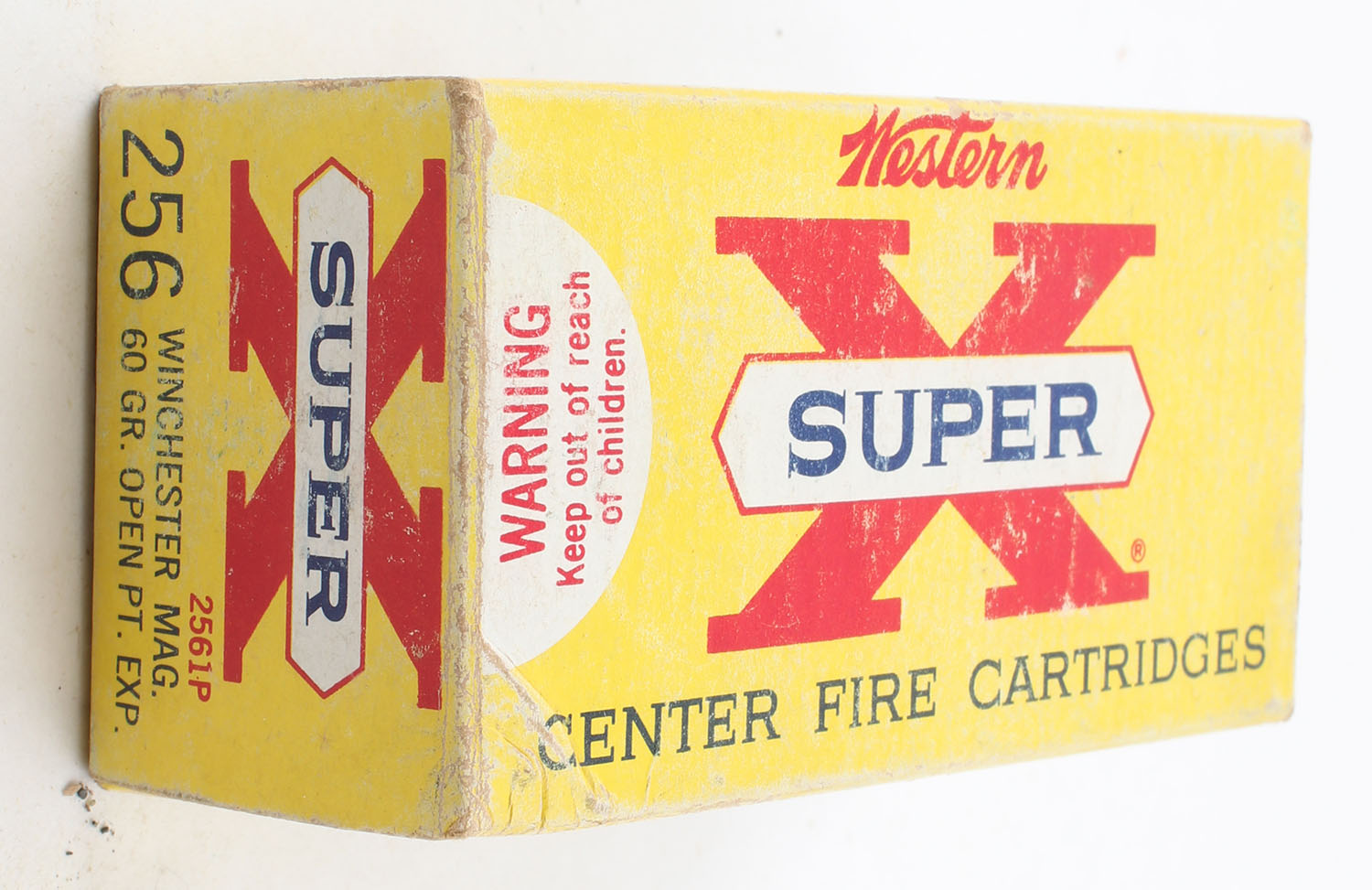 Western, Super X, .256 Winchester Magnum, 60 Grain Open Point Expanding, Full, 1pc. Yellow white & red box, box is solid with very good color, has light age soiling, light edge & corner wear, end flaps are solid, ammo is excellent. Grade: Excellent - Value: 100 to 150