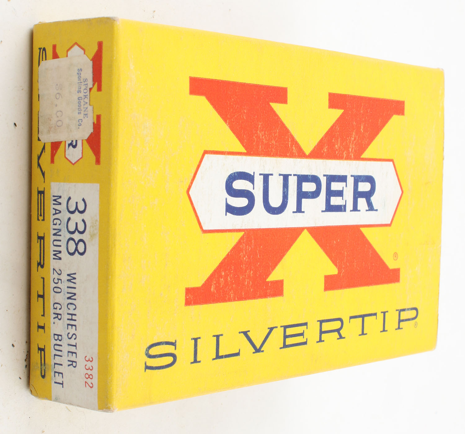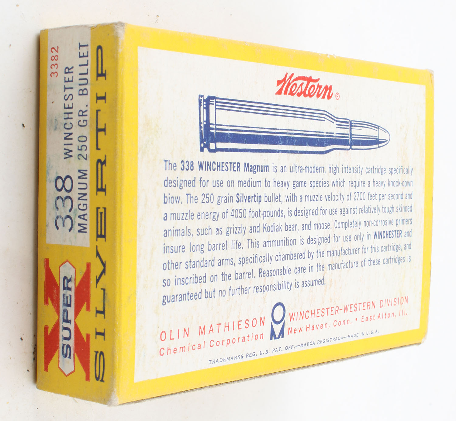 Western, Super X Silvertip, .338 Winchester Magnum, 250 Grain Bullet, Full, 1pc. Yellow white & red box, box is very solid with very good color, edges are mostly crisp, corners are sharp, end flaps are solid, ammo is excellent. Grade: Excellent + - Value: 60 to 90