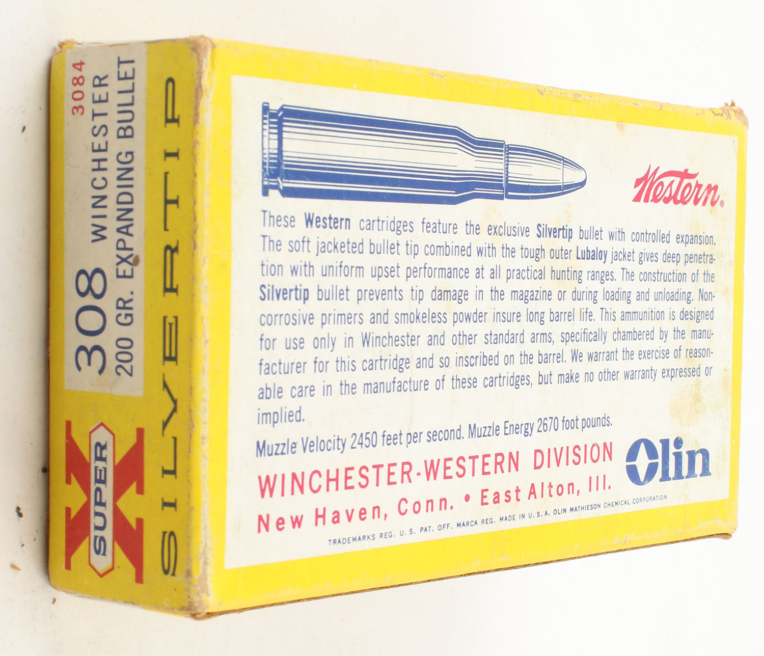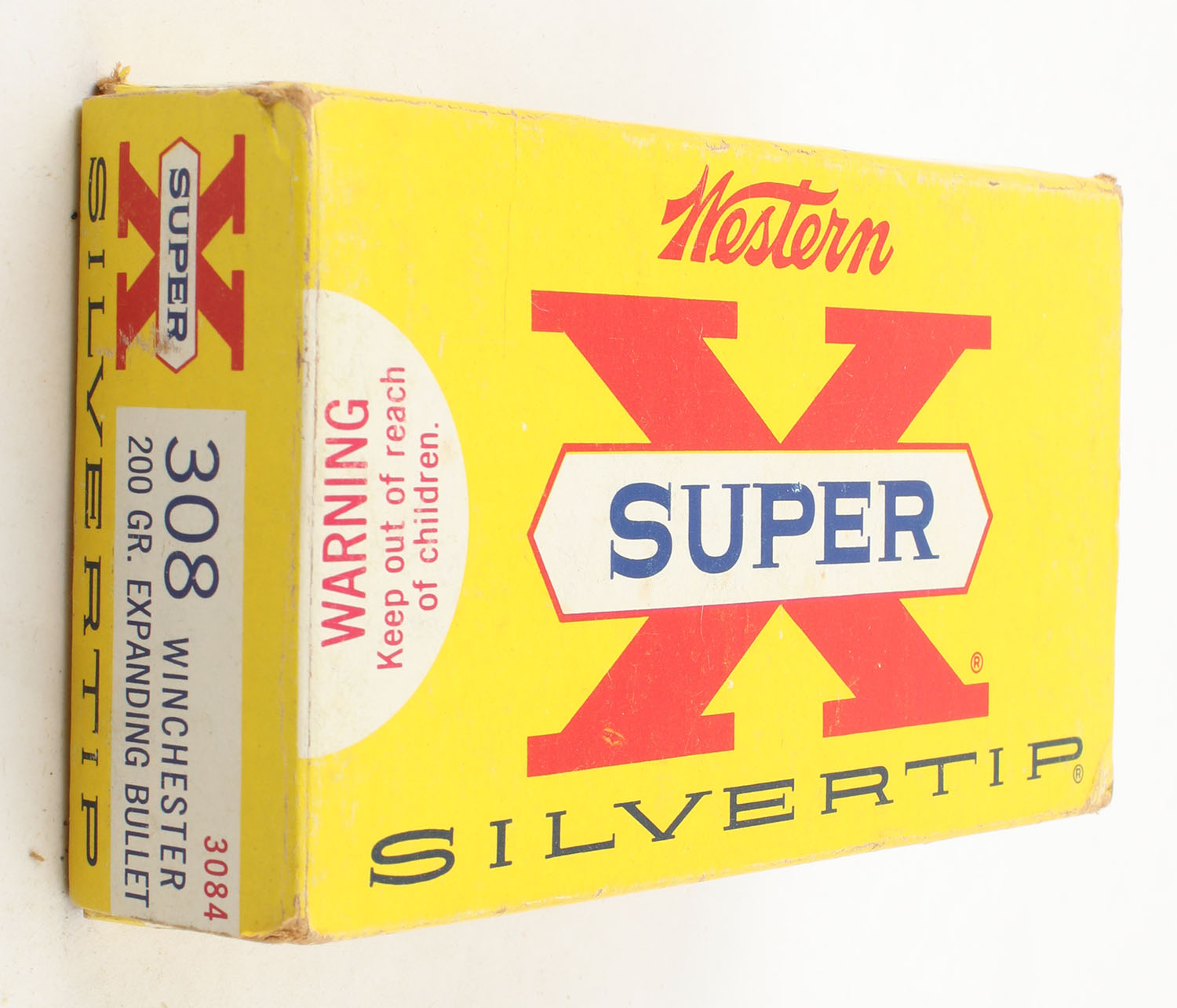 Western, Super X Silvertip, .308 Winchester, 2000 Grain Expanding Bullet, Full, 1pc. Yellow white & red box, box is solid with very good color, has shelf wear, light edge & corner wear, end flaps are solid, ammo is excellent. Grade: Very Good ++ - Value: 20 to 50