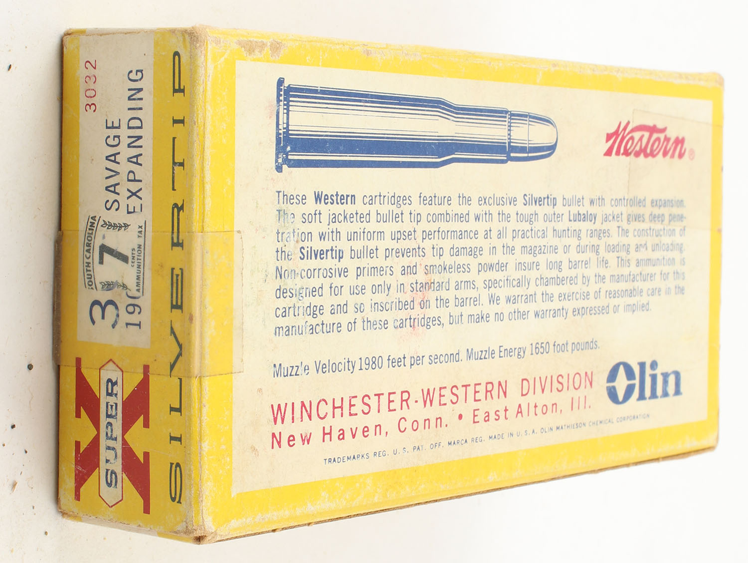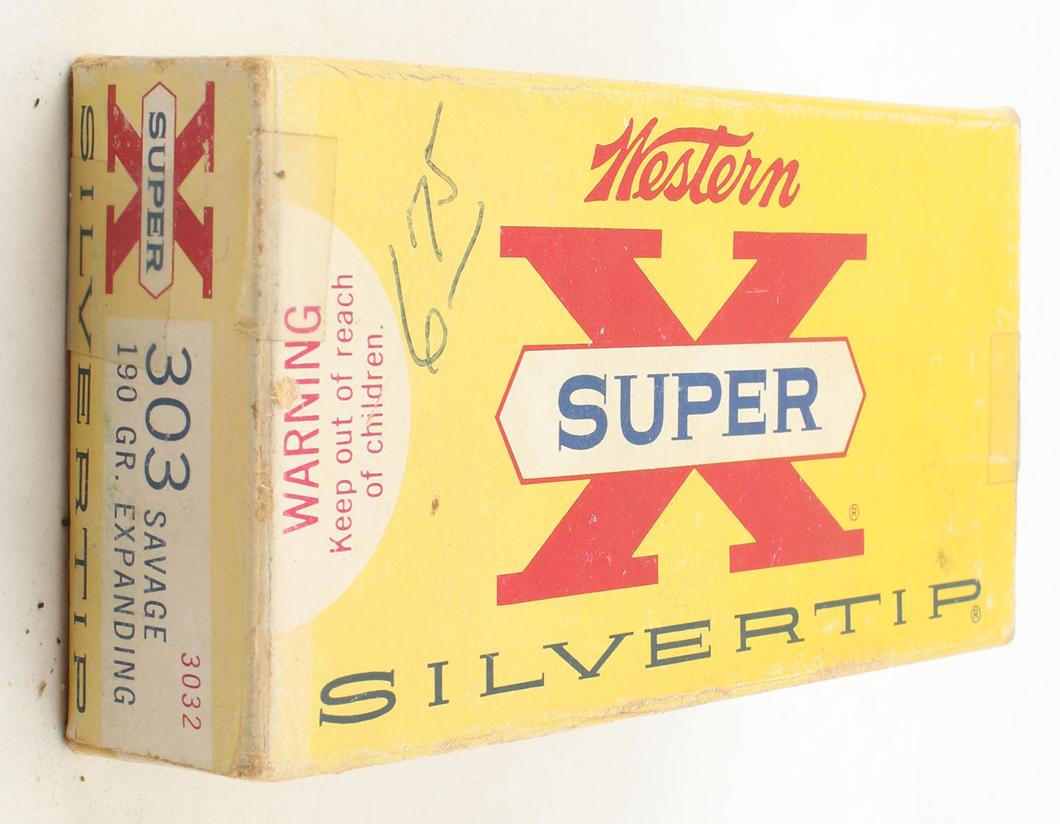 Western, Super X Silvertip, .303 Savage, 190 Grain Expanding Bullet, Full, 1pc. Yellow white & red box, box is solid with good color, has edge & corner wear, light age soiling, end flaps are solid, ammo is excellent. Grade: Very Good ++ - Value: 20 to 60