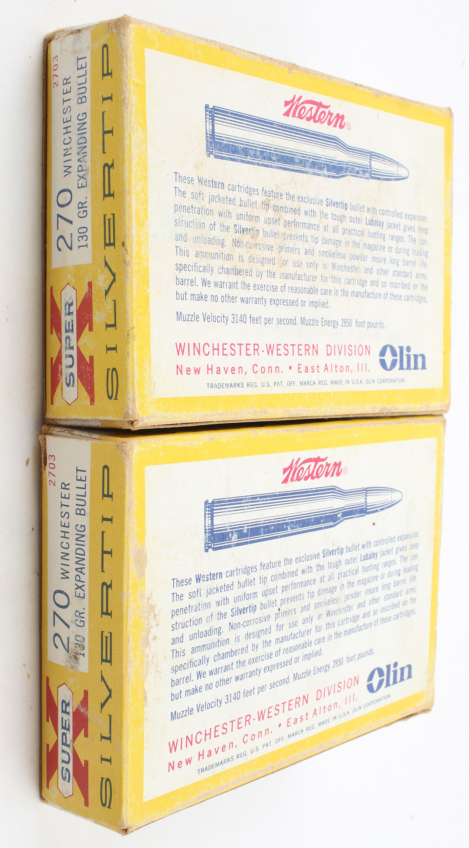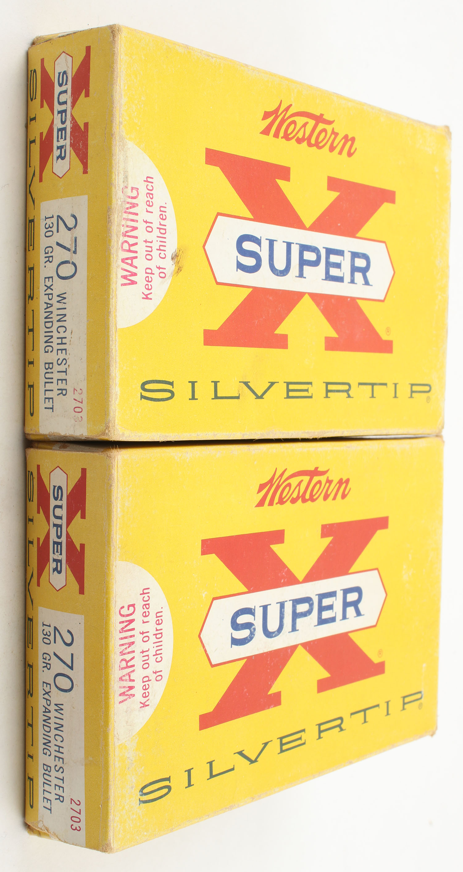 Western, Lot of (2), Super X Silvertip, .270 Winchester, 130 Grain Expanding Bullet, Partial 16rds. (32rds.), 1pc. Yellow white & red boxes, boxes are solid with very good color, ammo is good to excellent. Grade: Very Good - Value: 20 to 60
