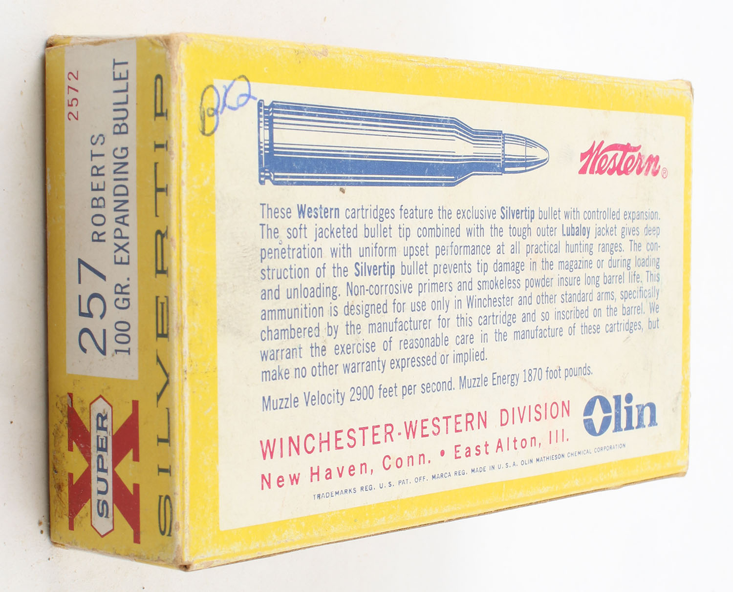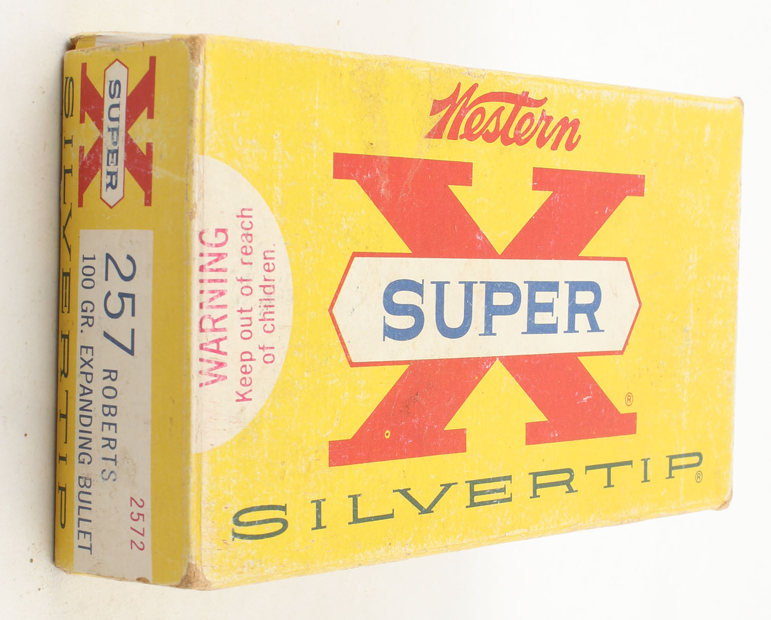 Western, Super X Silvertip, .257 Roberts, 100 Grain Expanding Bullet, Full, 1pc., Yellow white & red box, box has shelf wear, light edge & corner wear, end flaps are solid, ammo is excellent. Grade: Very Good ++ - Value: 20 to 60