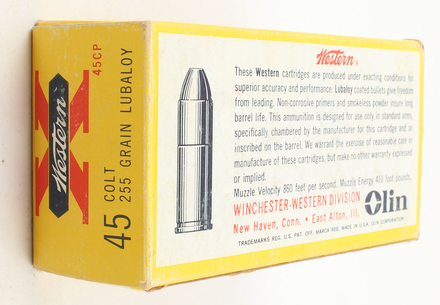 Western, X, .45 Colt, 255 Grain Lubaloy, Partial 34rds., 1pc. Yellow white & red box, box is solid with excellent color, minor shelf wear, light corner wear, end flaps are solid, ammo is excellent. Grade: Excellent - Value: 20 to 60