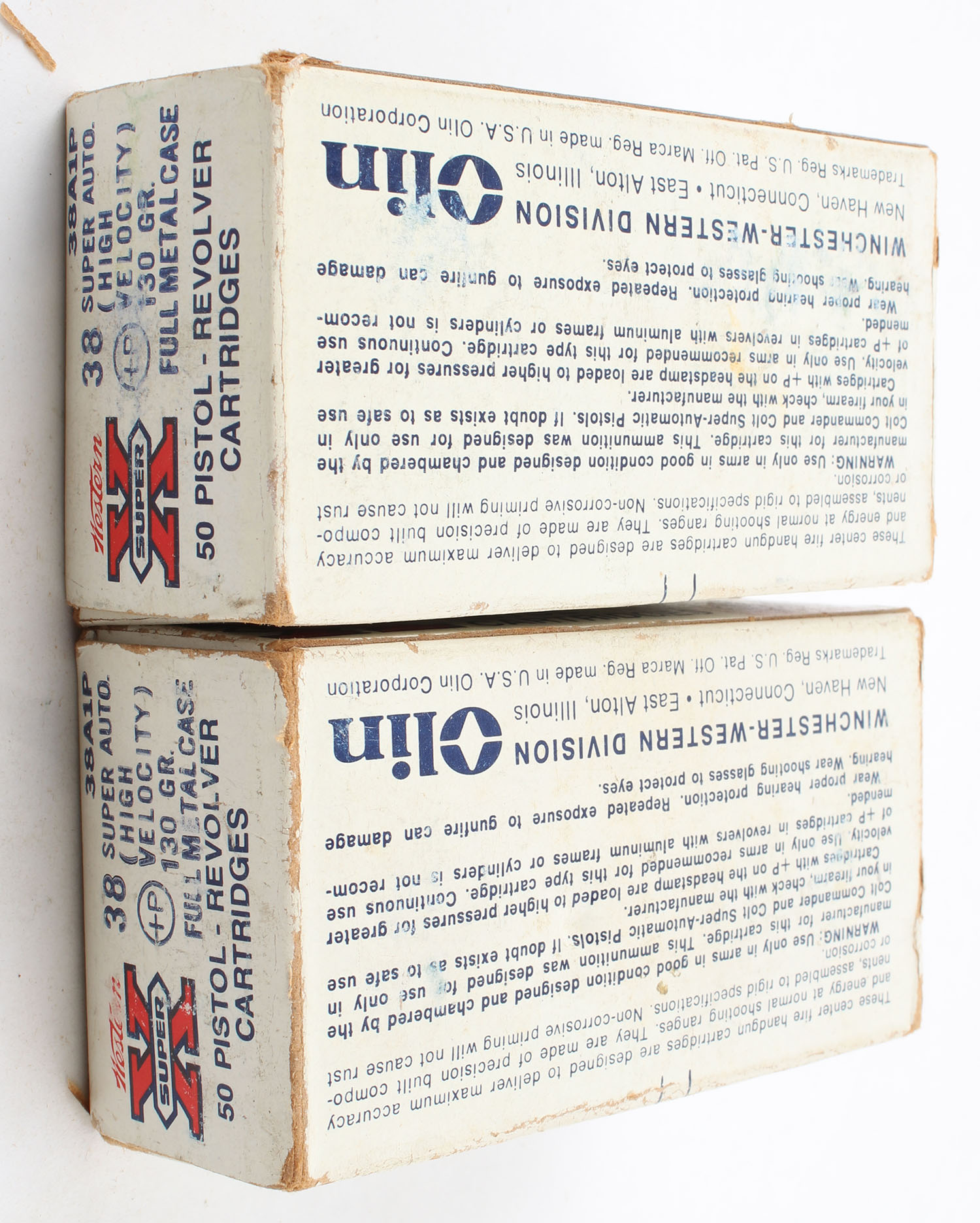 Western, Lot of (2), Super X, .38 Super Auto., (High Velocity), 130 Grain Full Metal Case +P, Full, 1pc. White & red boxes, boxes are solid with good color, (1) box has a tear to front, end flaps are solid, ammo is excellent. Grade: Very Good - Value: 30 to 60