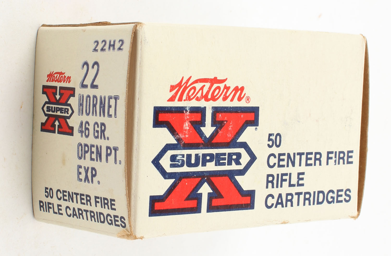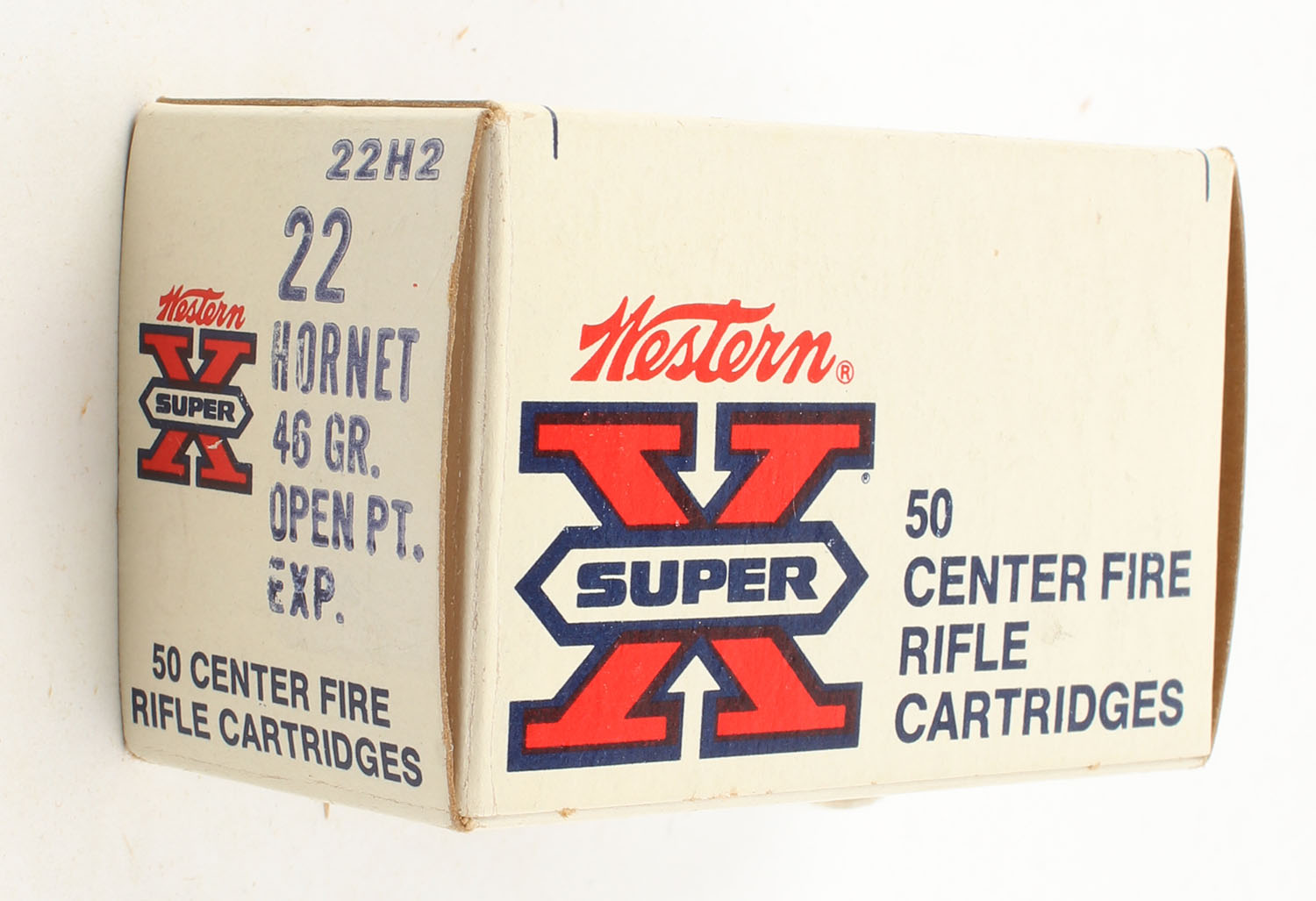 Western, Super-X, .22 Hornet, 46 Grain Open Point Expanding, Full, 1pc. White & red box, box is very solid with excellent color, has light shelf wear, end flaps are solid, ammo is very good. Grade: Excellent - Value: 40 to 80