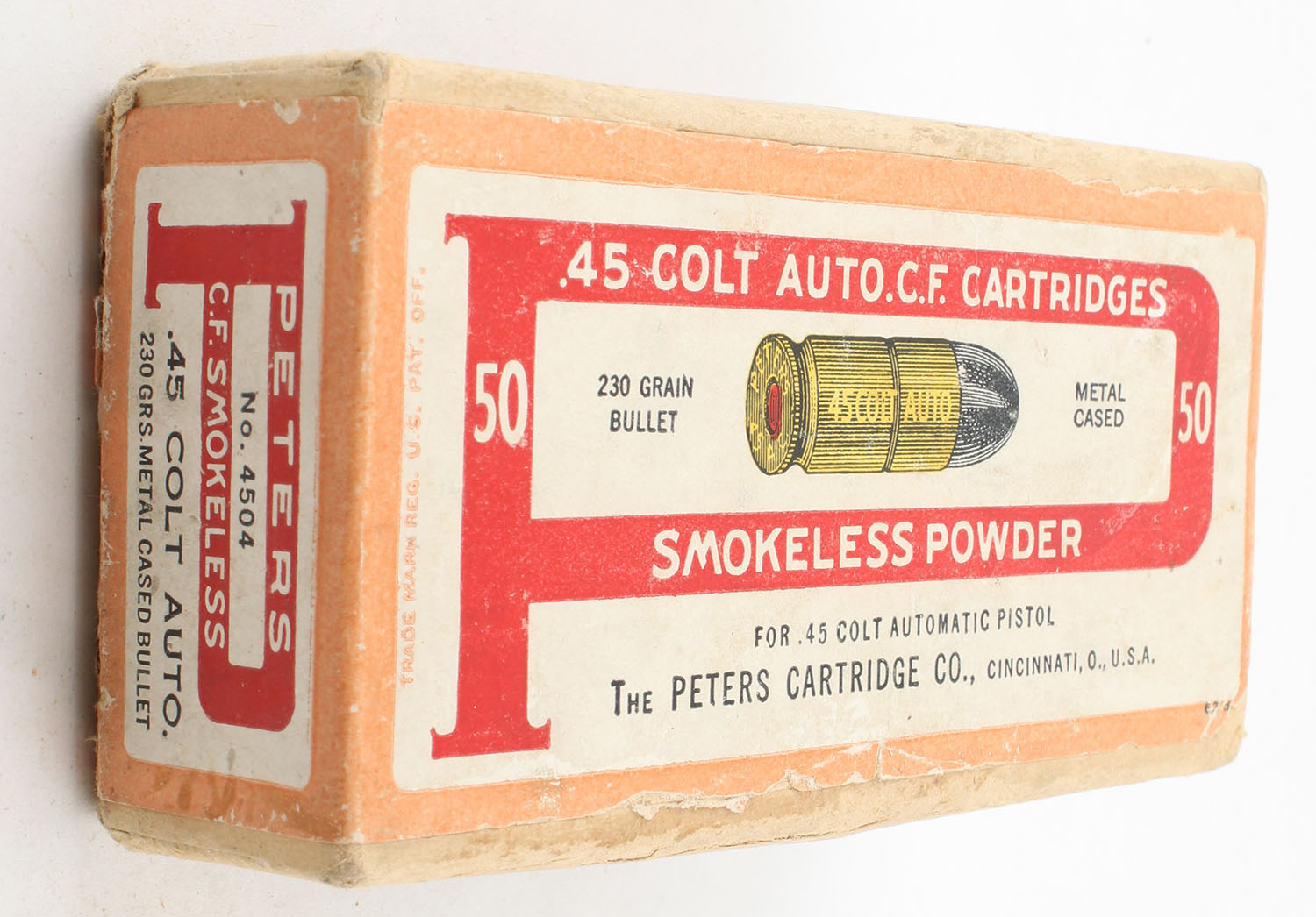 Peters, C.F. Cartridges, Smokeless, .45 Colt, 230 Grain Metal Cased, Full, 2pc. Buff box with red & orange labels, box is very solid with excellent color, has light shelf wear, partial seam split to bottom, light edge & corner wear, labels are intact, ammo is excellent. Grade: Very Good ++ - Value: 40 to 100