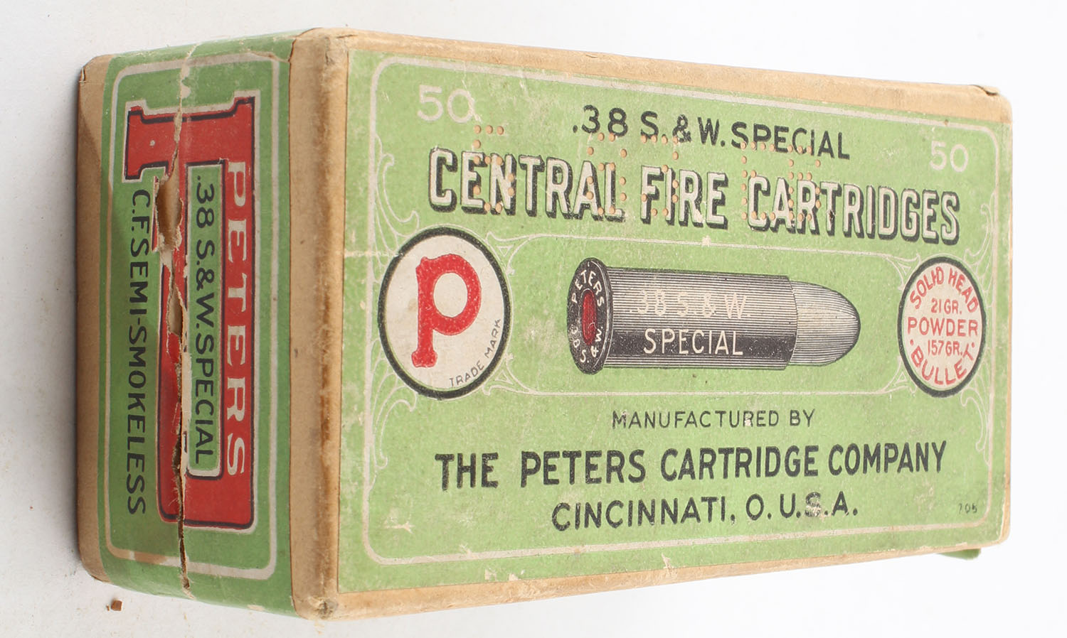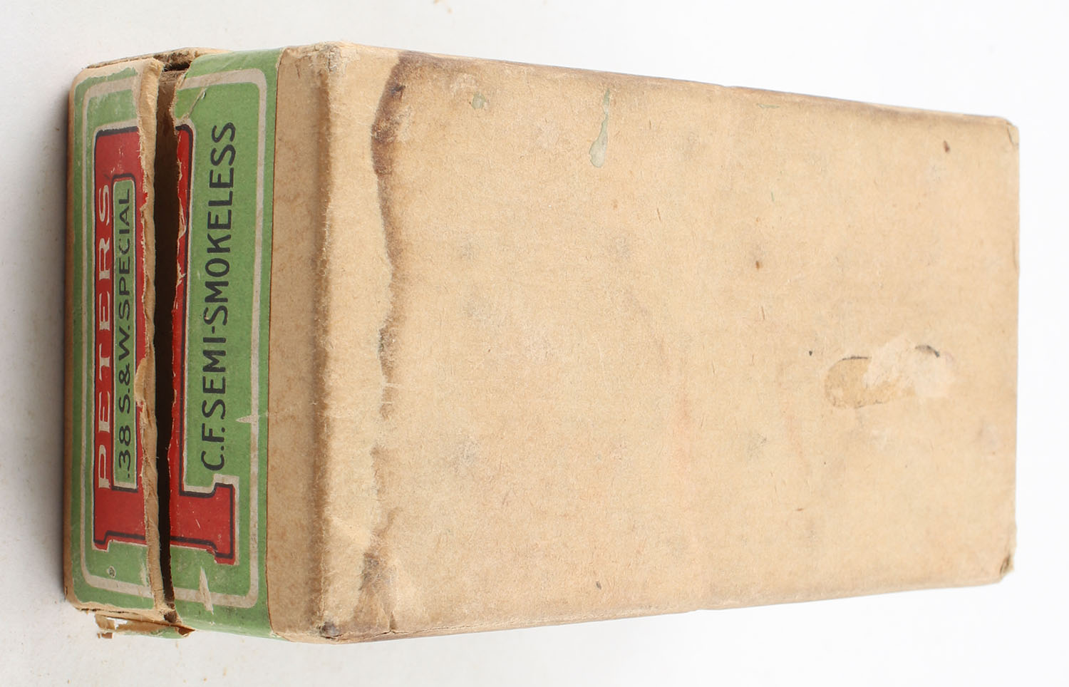 Peters, Central Fire Cartridges, .38 Smith & Wesson Special, 157 Solid Head Bullet, Full, 2pc. Buff box with green & red top & side sealing labels, box is very solid with excellent color, has vertical seam splits to top, has light scuffing, minor edge & corner wear, labels are intact, ammo is excellent. Grade: Very Good ++ - Value: 40 to 100