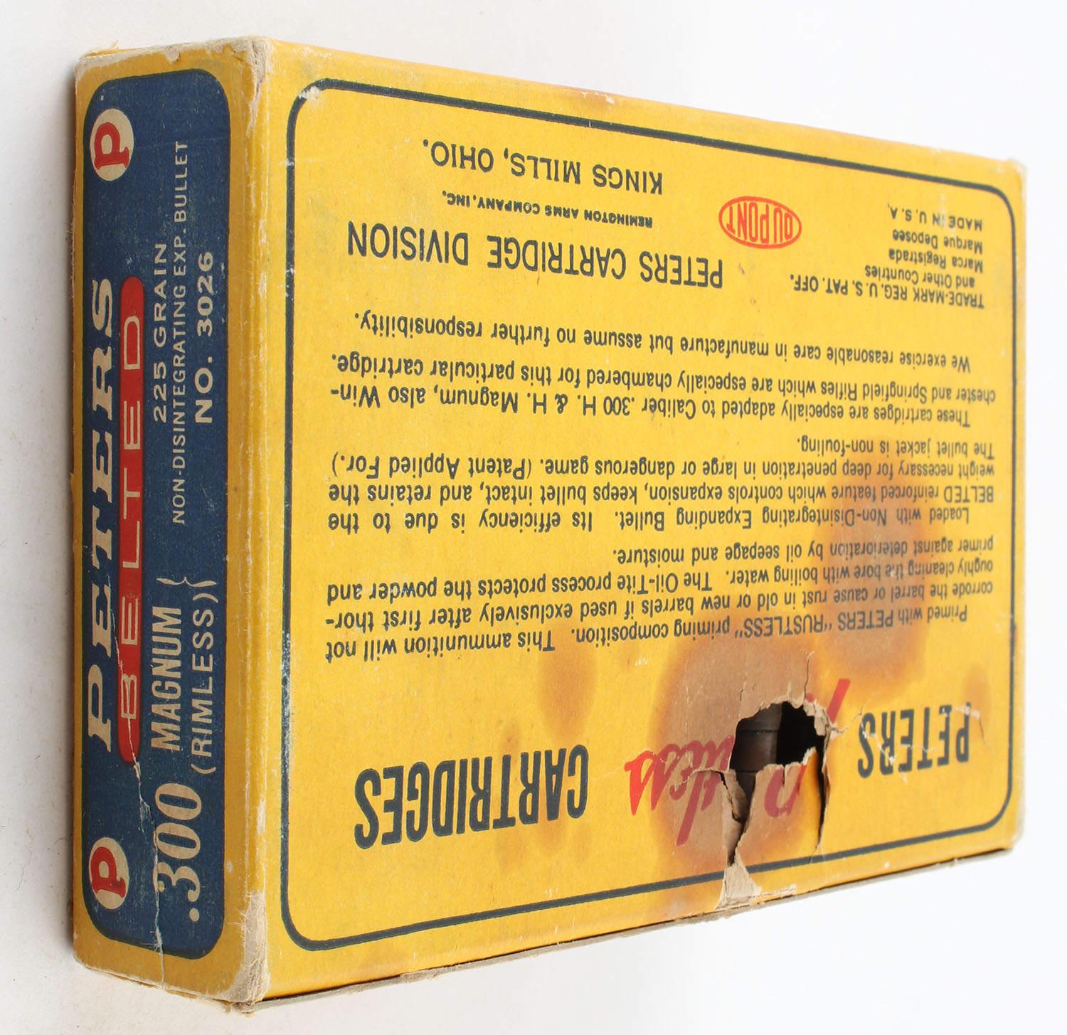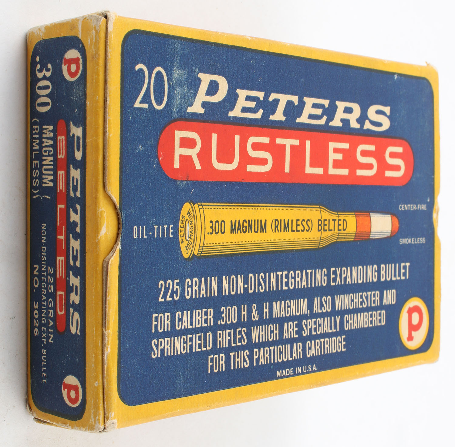 Peters, Rustless, .300 Magnum (Rimless), 225 Grain Non-Disintegrating Expanding Bullet, Partial 19rds., 1pc. Blue & yellow box, box is very solid with excellent color, has a partial tear to back of box with some staining to box, end flaps are solid, ammo is good to very good. Grade: Very Good + - Value: 40 to 100