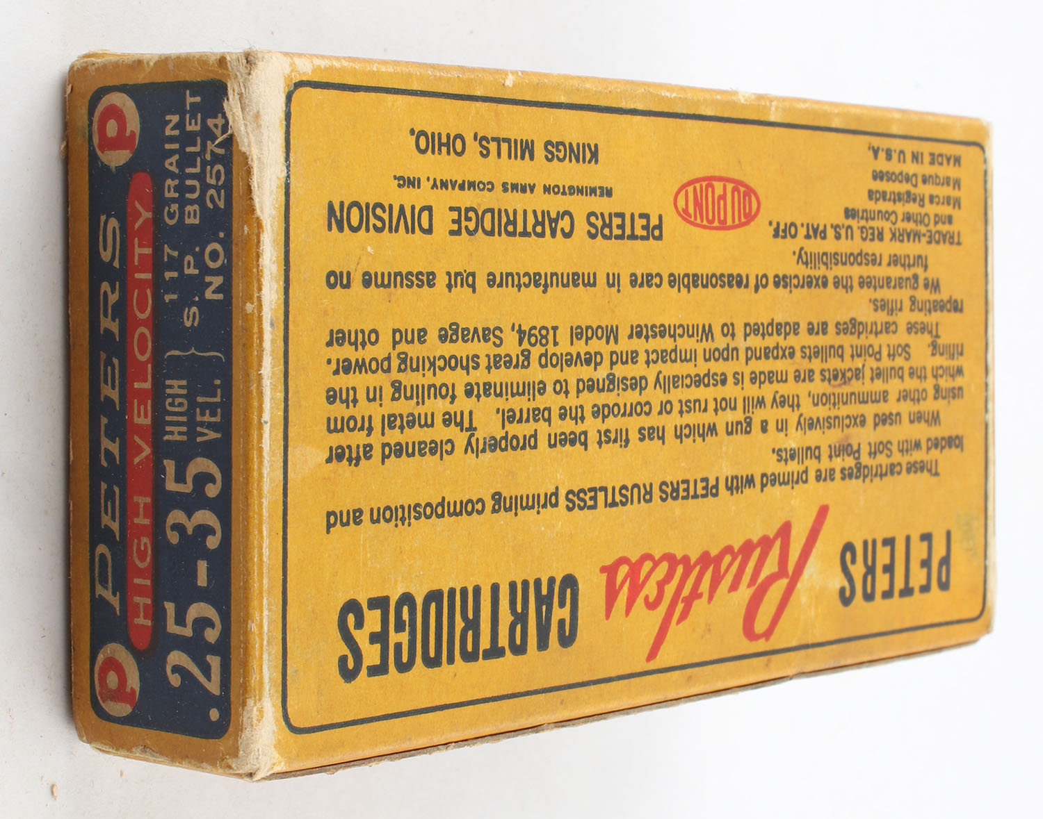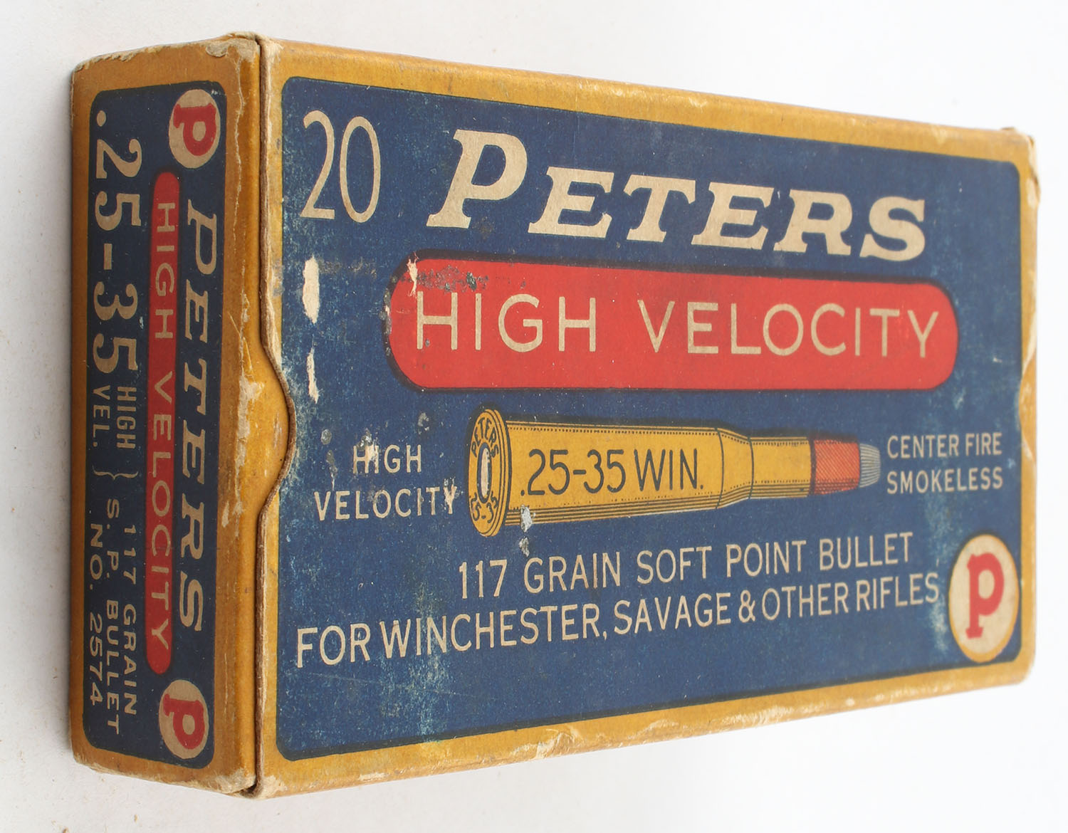 Peters, High Velocity, .25-35 Winchester, 117 Grain Soft Point, Full, 1pc. Blue yellow & red box, box has light age soiling, edge & corner wear, end flaps are solid, ammo is good to very good. Grade: Very Good - Value: 40 to 80