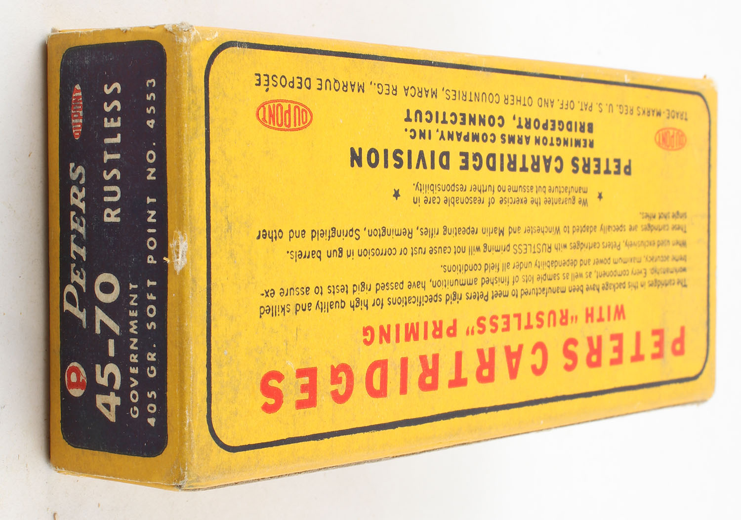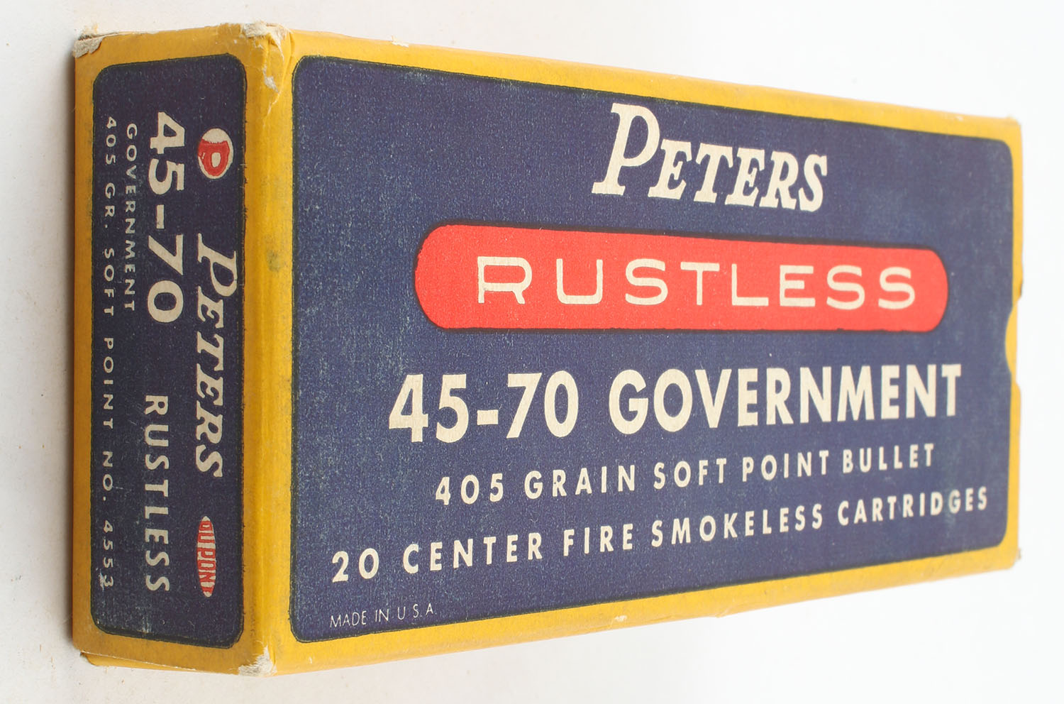 Peters, Rustless, .45-70 Government, 405 Gr. Soft Point Bullet, Smokeless, Full, 1pc. Blue yellow & red box, box is very solid with excellent color, very minor corner wear, edges are crisp, end flaps are solid, ammo is minty. Grade: Excellent + - Value: 30 to 60