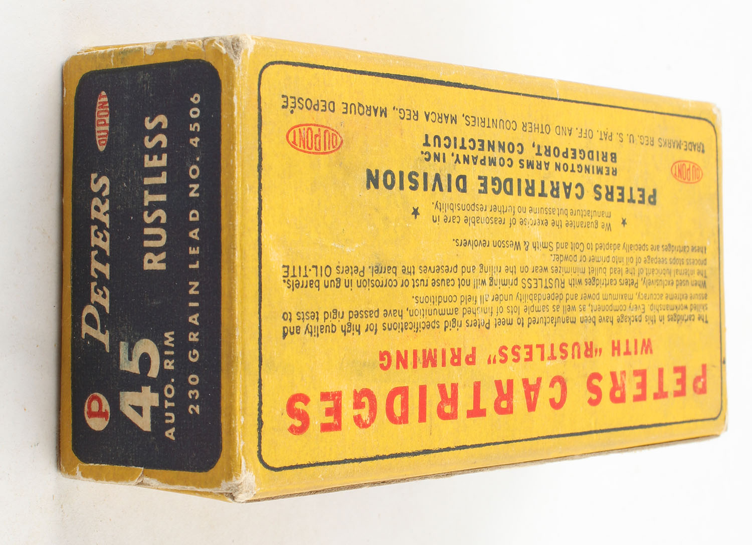 Peters, Rustless, .45 Automatic Rim, 230 Grain Lead, Full, 1pc. Blue yellow & red box, box is solid with good color, has minor age soiling, edge & corner wear, end flaps are solid, ammo is excellent. Grade: Very Good - Value: 20 to 80