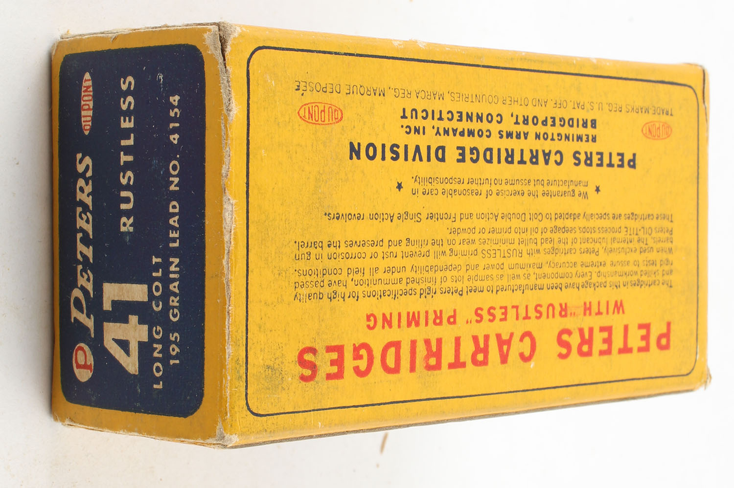 Peters, Rustless, .41 Long Colt, 195 Grain Lead Bullet, Full, 1pc. Yellow blue & red box, box is very solid with excellent color, has light shelf wear, very minor corner wear, end flaps are solid, ammo is excellent. Grade: Excellent - Value: 80 to 120