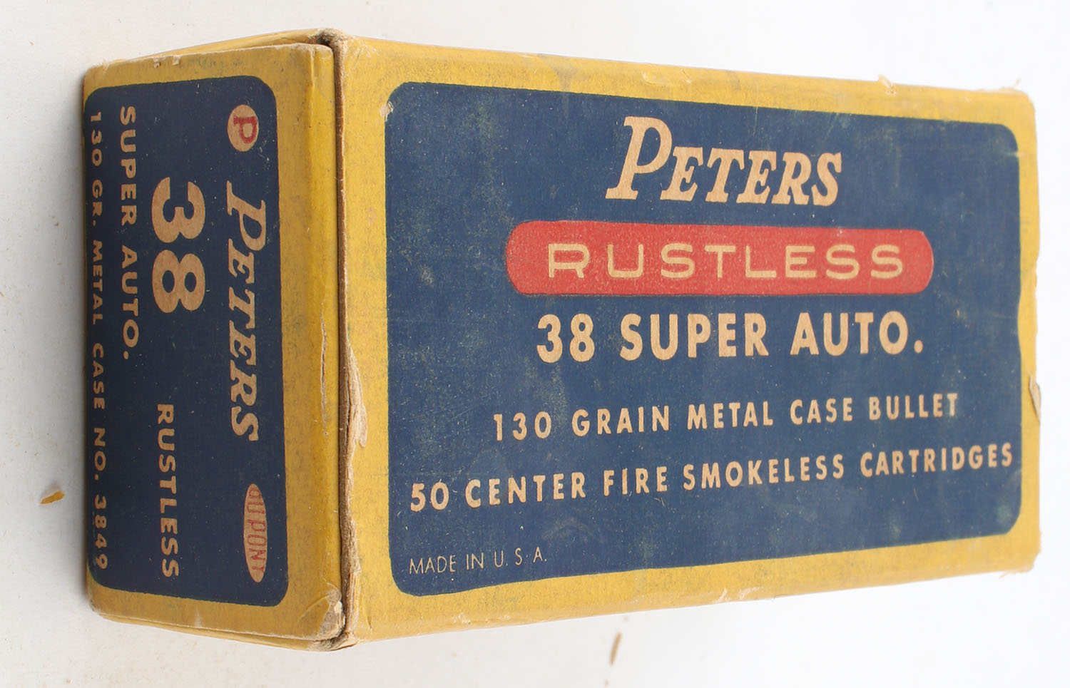Peters, Rustless, .38 Super Auto., 130 Grain Metal Case Bullet, Full, 1pc. Blue yellow & red box, box is solid with excellent color, minor shelf wear, some corner wear, very minor edge wear, end flaps are solid, ammo is excellent. Grade: Excellent - Value: 50 to 75