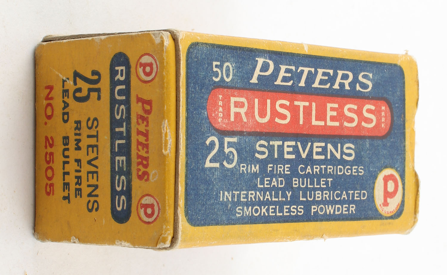 Peters, Rustless, .25 Stevens Rim Fire, Lead Bullet, Full with 1 ''U'' H/S, 1pc. Blue yellow & red box, box is solid with very good color, some age soiling & shelf wear, some corner wear, end flaps are solid, ammo is excellent. Grade: Very Good ++ - Value: 40 to 120
