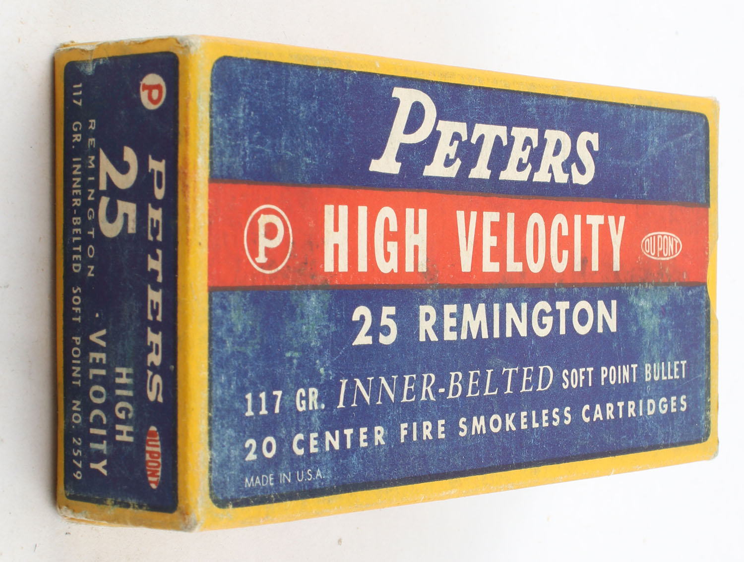 Peters, High Velocity, .25 Remington, 117 Grain Inner-Belted Soft Point Bullet, Full, 1pc. Blue yellow & red box, box is very solid with very good color, has scuffing with minor corner wear, end flaps are solid, ammo is excellent. Grade: Excellent - Value: 50 to 75