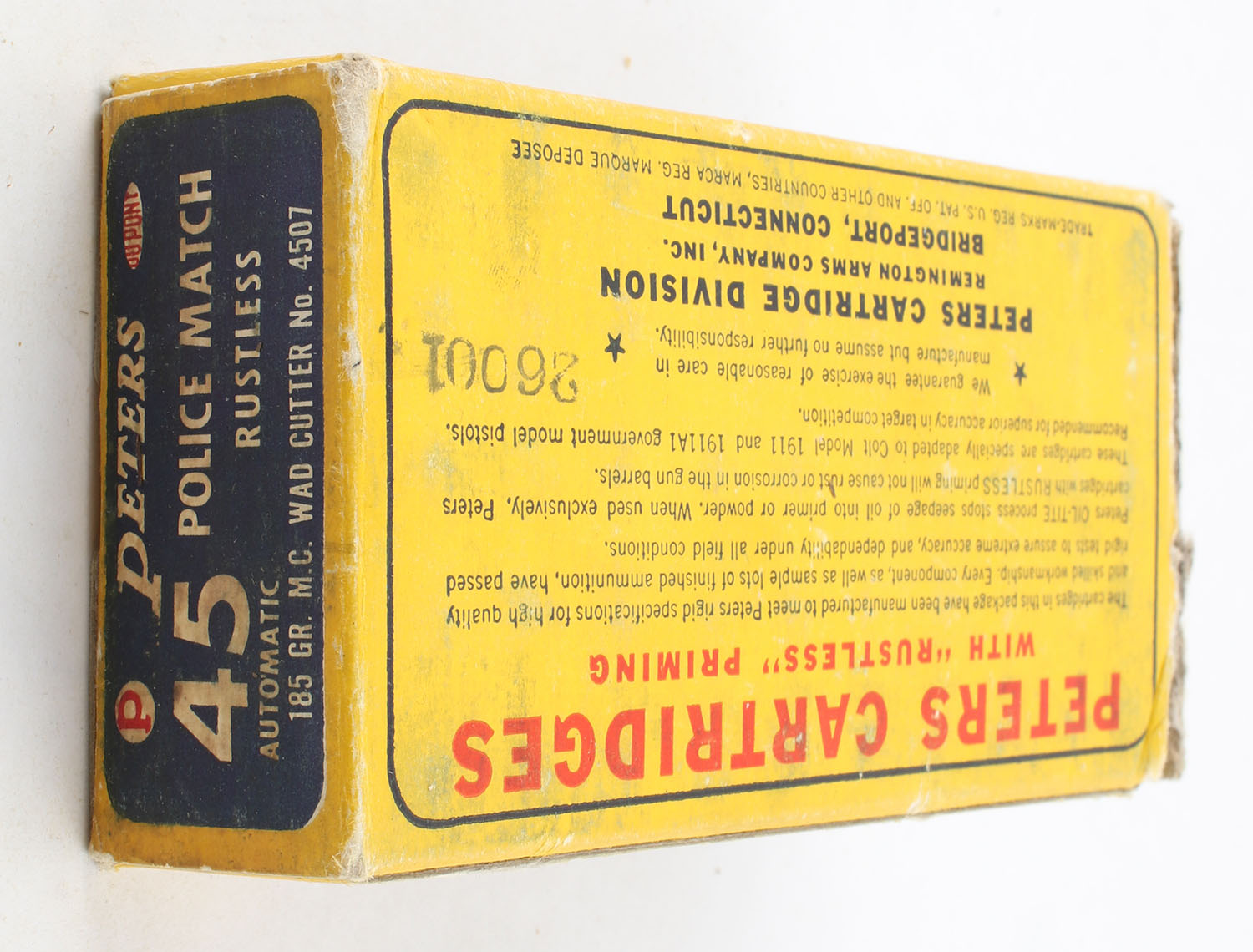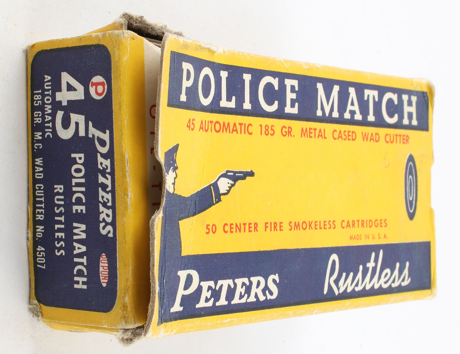 Peters, Police Match, .45 Automatic, 185 Grain M.C. Wad Cutter, Full, 1pc. Yellow blue & white box, box is solid with excellent color, minor shelf & corner wear, has minor scuffing, end flaps are solid, ammo is excellent. Grade: Excellent - Value: 40 to 60