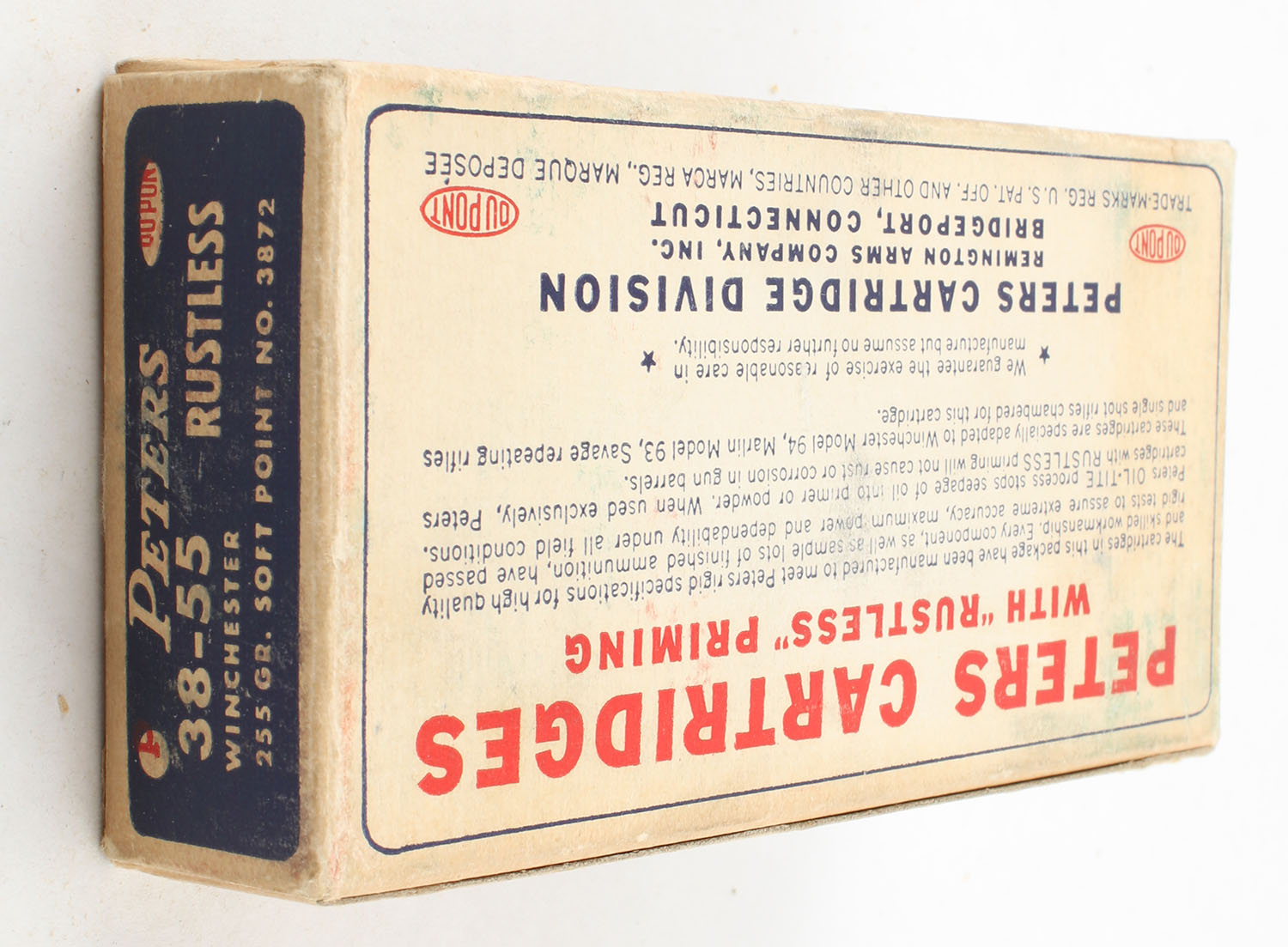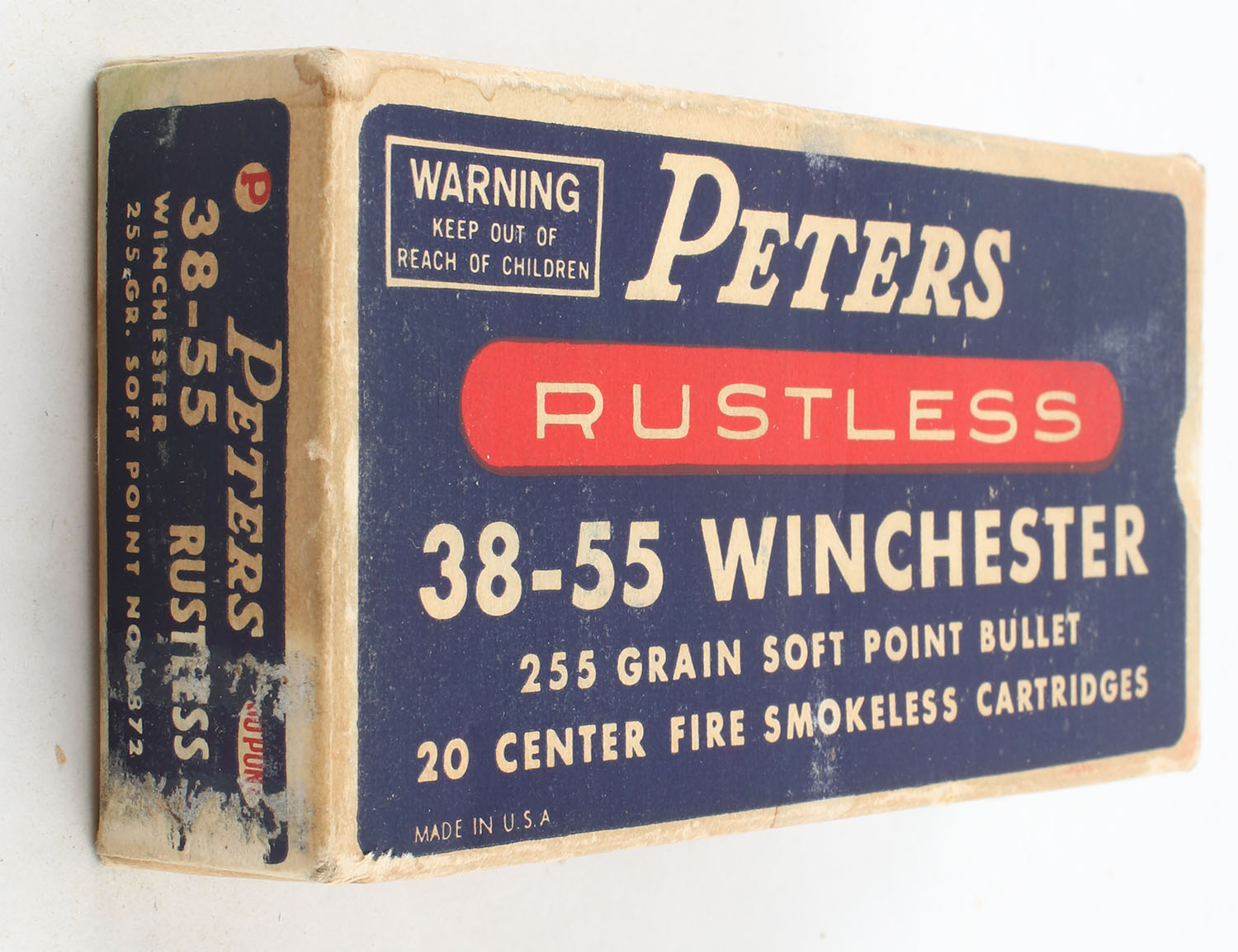 Peters, Rustless, .38-55 Winchester, 255 Grain Soft Point Bullet, Full, 1pc. Blue white & red box, box is very solid with excellent color, box has light edge & corner wear, light scuffing, end flaps are solid, ammo is excellent. Grade: Excellent - Value: 20 to 60