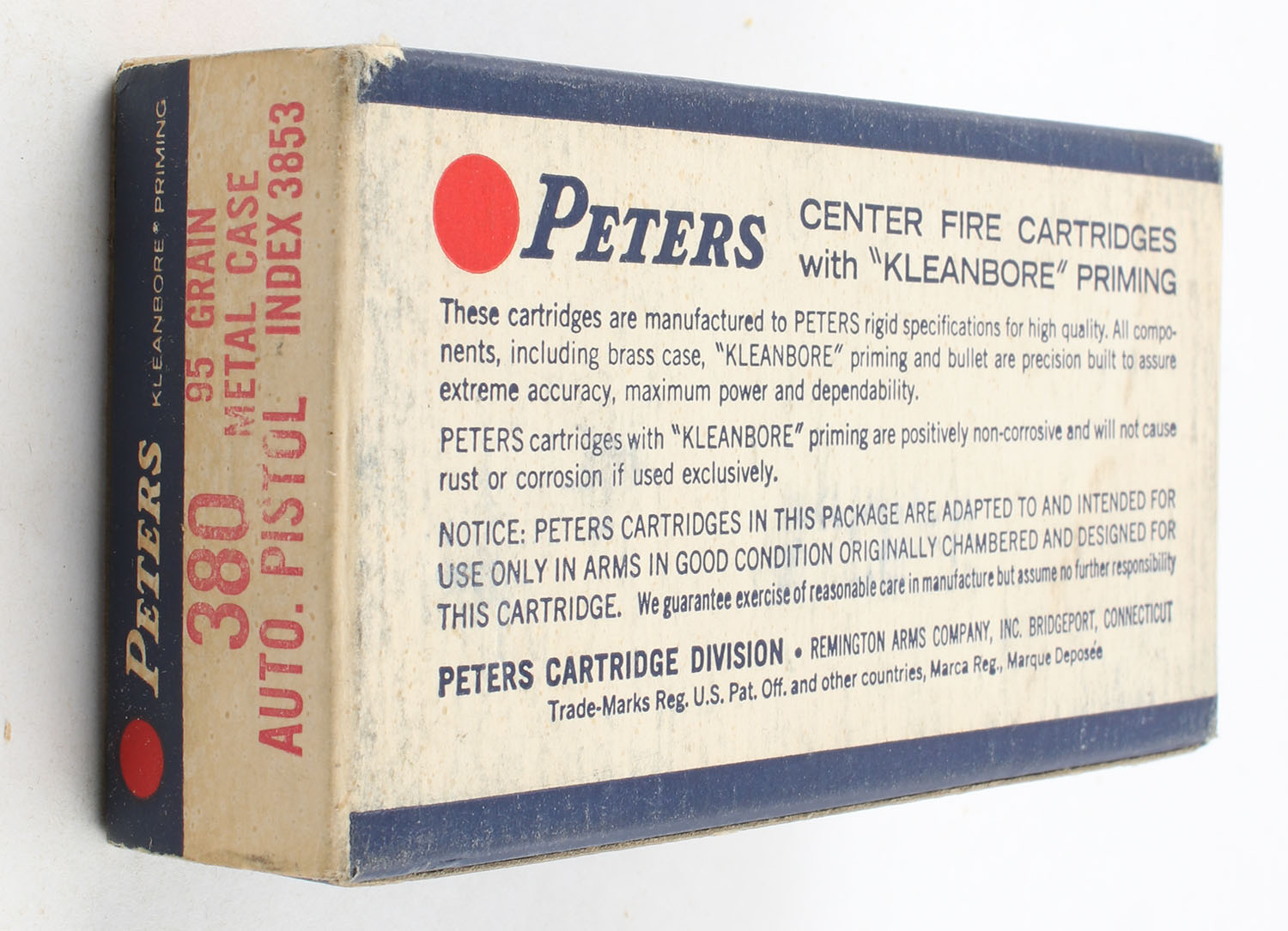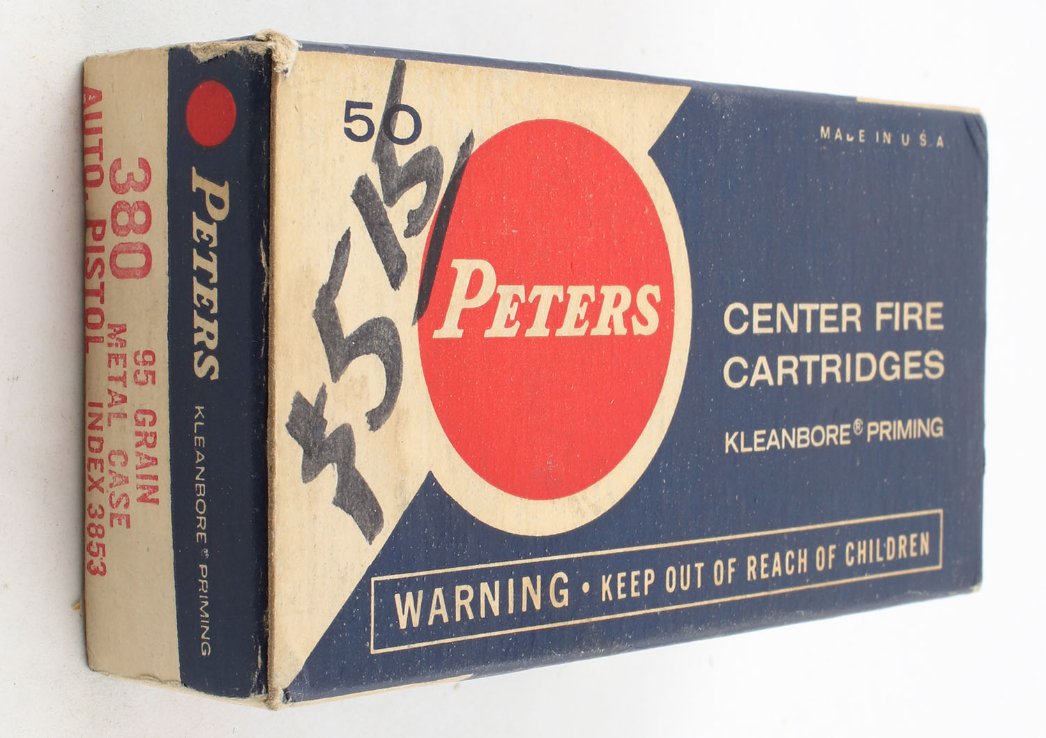 Peters, Center Fire Cartridges, .380 Automatic, 95 Grain Metal Case, Full, 1pc. Blue white & red box, box is solid with very good color, some age soiling & corner wear, end flaps are solid, ammo is excellent. Grade: Very Good ++ - Value: 20 to 30